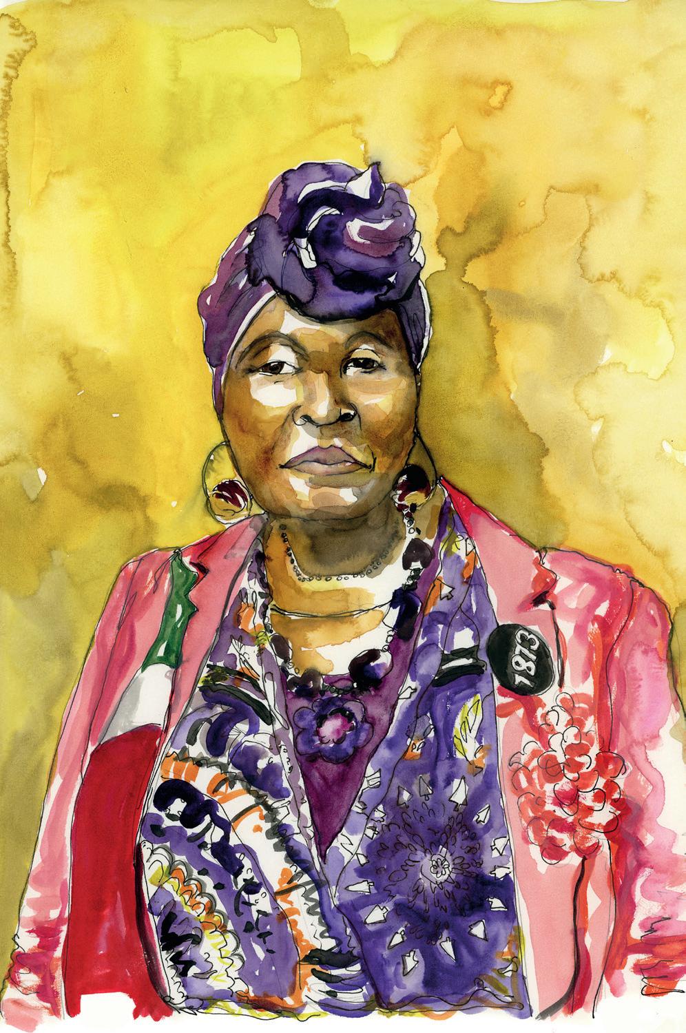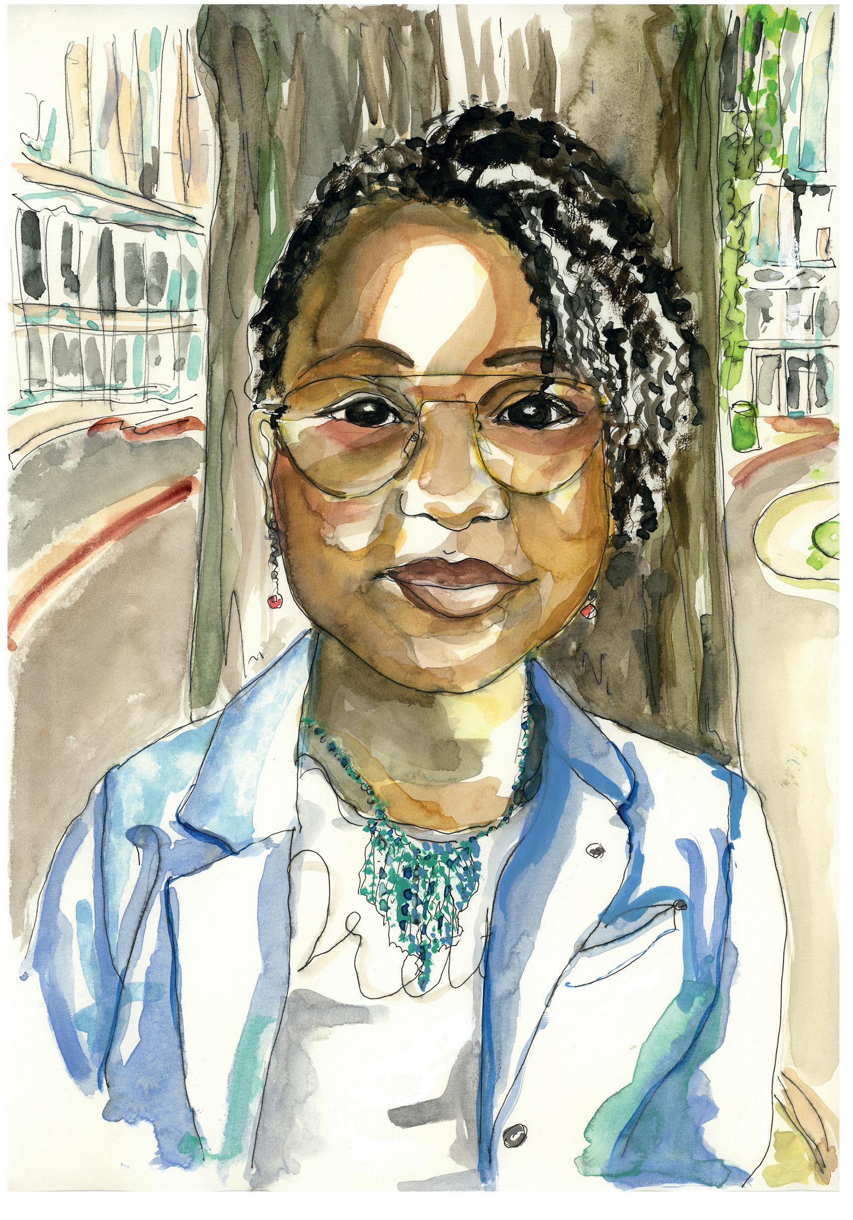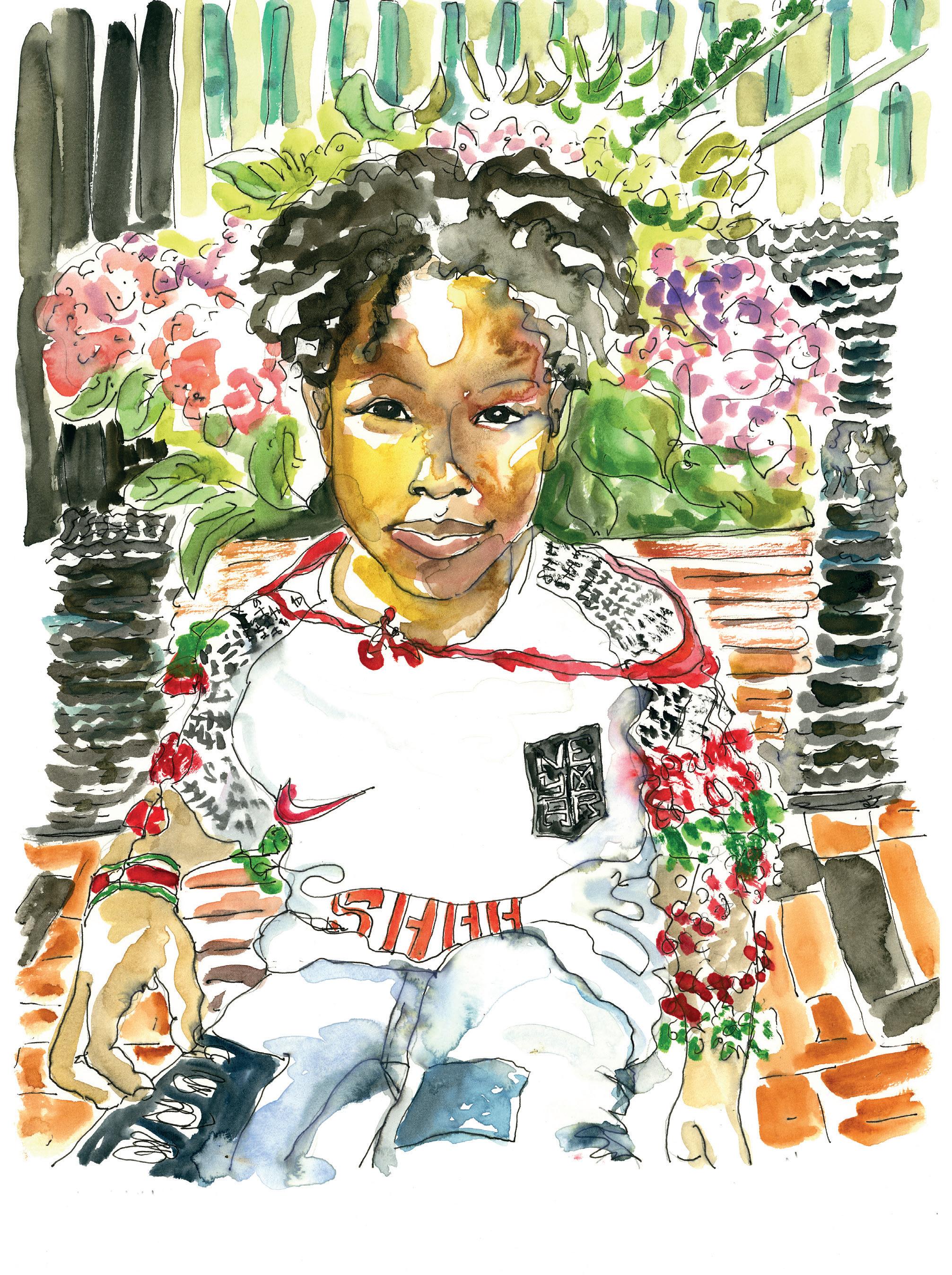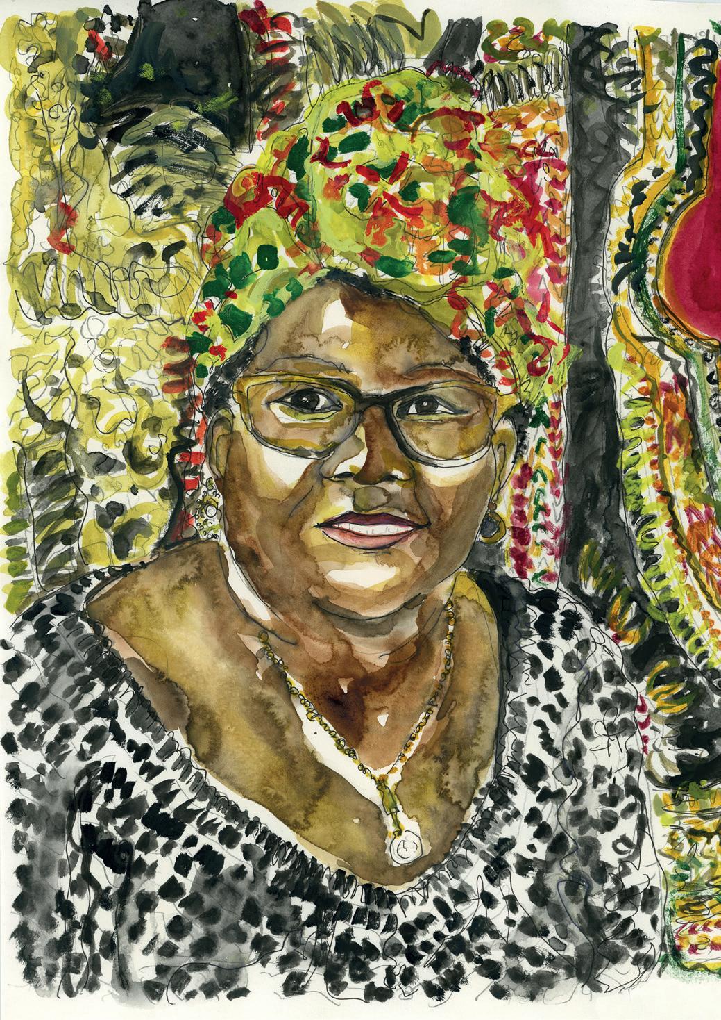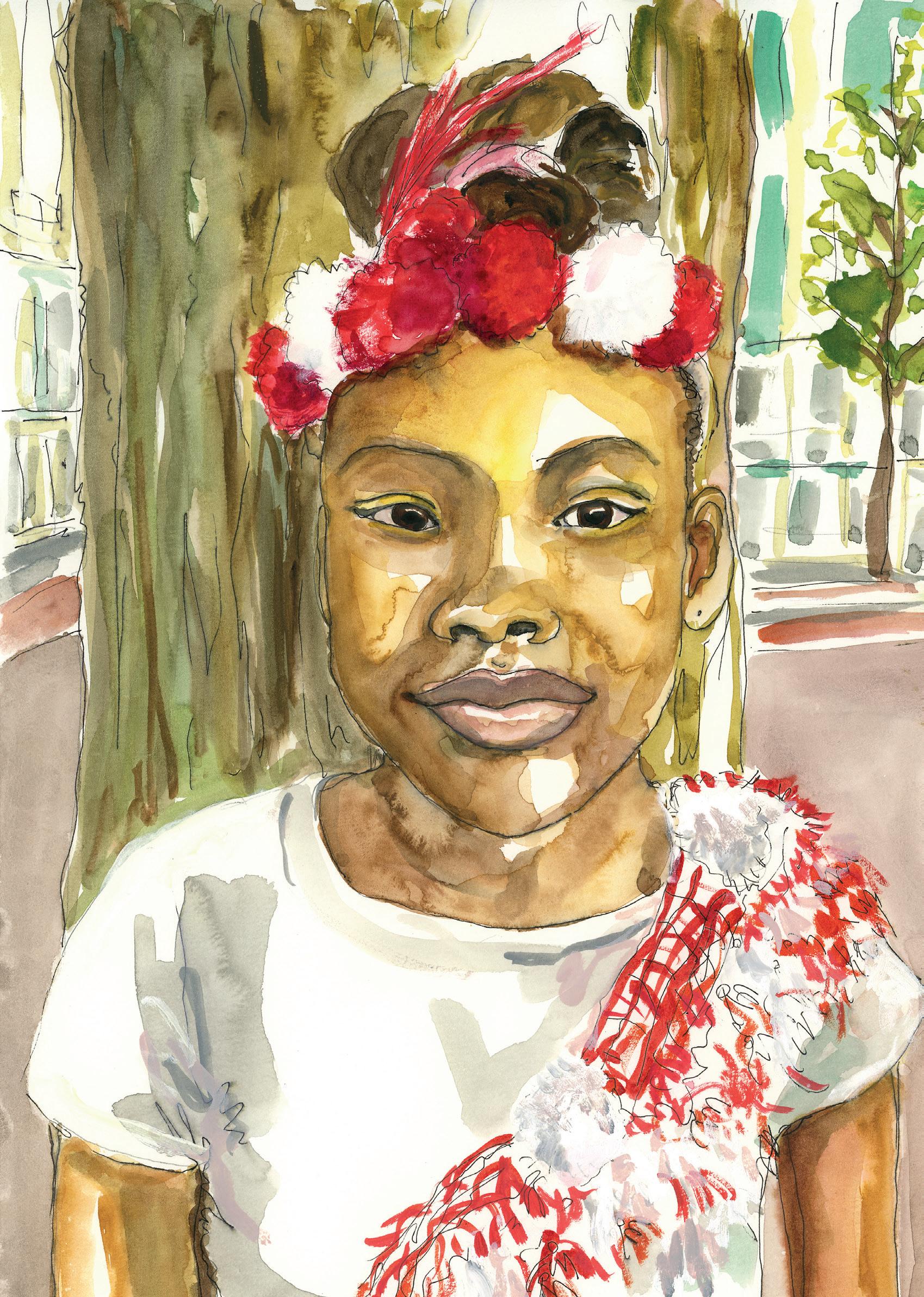 En zo komen we bij de eerste portretten in dit boek. Het was 1 juli 2020, ruim een maand na de moord op George Floyd in Minneapolis (VS) op 25 mei. Ik liep rond met het gevoel dat ik iets moest doen, ik wilde er als kunstenaar op reageren, meer doen dan alleen demonstreren op de Dam. Maar wat? Die middag, op weg naar station Bijlmer Arena, toen ik al die mensen zag lopen, werd het idee geboren om ze aan te spreken en te vragen of ik hun portret mocht maken, met pen en aquarel, net zoals ik in 2019 in Paramaribo had gedaan. Met het verschil dat er weinig tijd was, dus in dit geval maakte ik foto’s om die later rustig uit te werken. Ik deed hetzelfde in het Compagnietheater. Ook daar vroeg ik de mensen of ze wilden poseren voor een portret. Voor een project over Keti Koti.