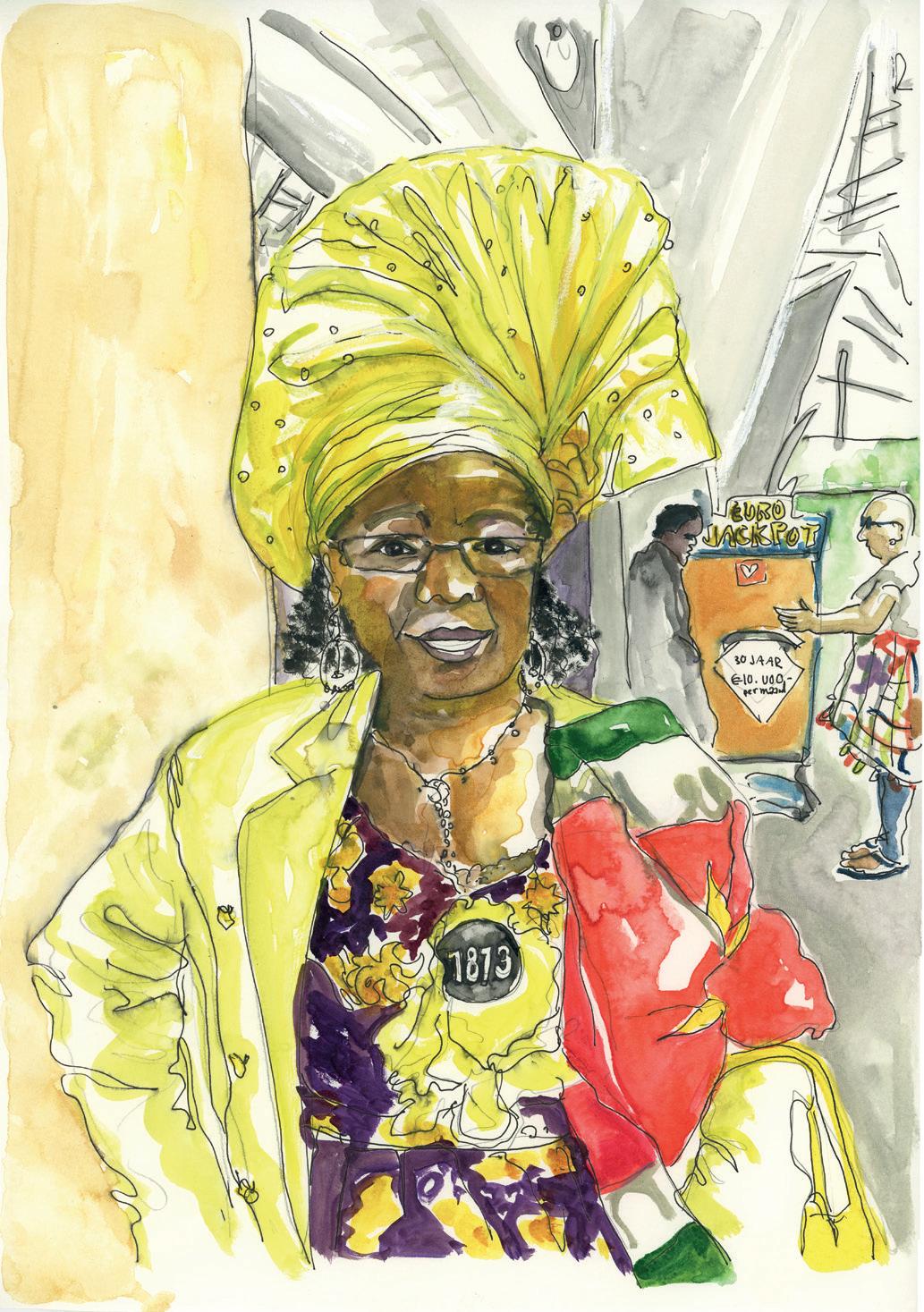 Ik woon in het centrum van Amsterdam maar kom graag in Zuidoost. Als kunstenaar ben ik bovendien verbonden met CBK Zuidoost, ik doe mee aan exposities en andere activiteiten, zoals BijlmAIR. In 2017 werkte ik daar vier weken als Artist in residence aan mijn project ‘Amsterdamse Mensen’. Ik maakte er tekeningen van mensen in de wijk, met pen en aquarel. Van een afstandje, dus zonder dat ik er vooraf toestemming voor had gevraagd. Wanneer mensen het zagen en het vervelend vonden, gooide ik de tekening weg. En als ze het leuk vonden kregen ze hem cadeau.