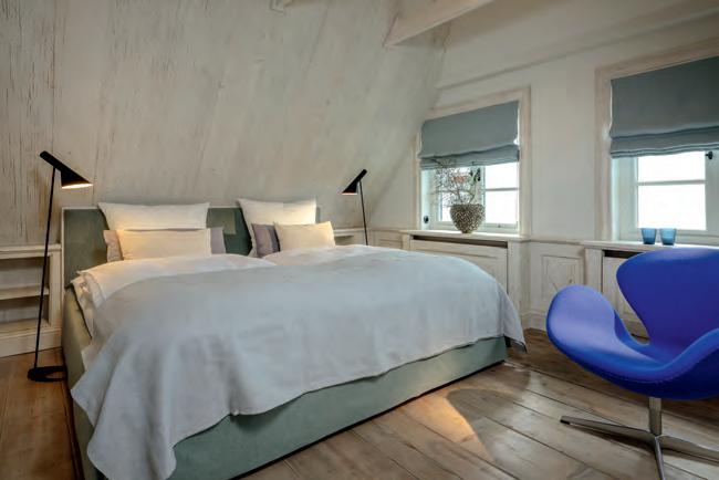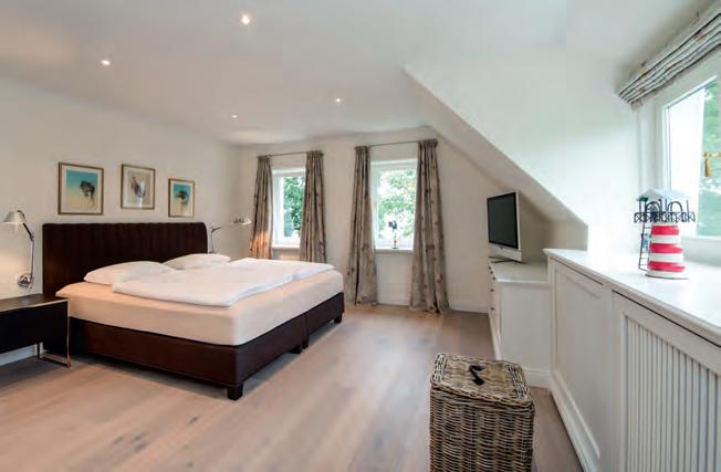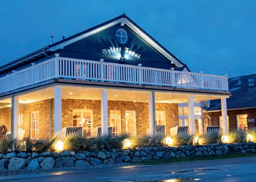 küche, u a. mit Backofen, Spülmaschine, Kaffeemaschine. Waschmaschine, Trockner, Bügelbrett und Bügeleisen komplettieren die Ausstattung. Die vier separaten Schlafzimmer sind charmante Rückzugsräume, die mit hochwertigen Doppelbetten ausgestattet wurden. Einer der Schlafräume verfügt über ein integriertes Duschbad. Darüber hinaus gibt es ein großzügiges Bad mit Sauna von Matteo Thun und Sanarium von Klafs, Badewanne und bodengleicher Dusche, ein weiteres Duschbad sowie ein Gäste-WC. Sollte während der Urlaubstage doch einmal die berufliche Pflicht rufen – ein Schreibtisch in der oberen Etage bietet Platz für ungestörtes Arbeiten. Bei Sonnenschein lockt der Garten mit edlen Outdoormöbeln. Im separaten Gartenhaus sorgt ein Gym für sportliche Betätigung. Zum Entspannen lädt ein luxuriöses Outdoor-Bed ein. Wer den Einrichtungsstil schätzt, findet in den stilvollen Interieur- Geschäften von Susanne und Oliver Suchy in der Keitumer Landstraße 12 (Alte Meierei) in Tinnum und in der Wedemark weitere Inspirationen. Ebenfalls neu hinzugekommen ist die Vermietung von Domizilen in Wennigstedt. Außerdem im Portfolio: das individuelle Boutiquehotel Sylter Zollhaus sowie das wunderschöne Restaurant Altes Zollhaus mit kulinarischen Köstlichkeiten vom Feinsten. ■
