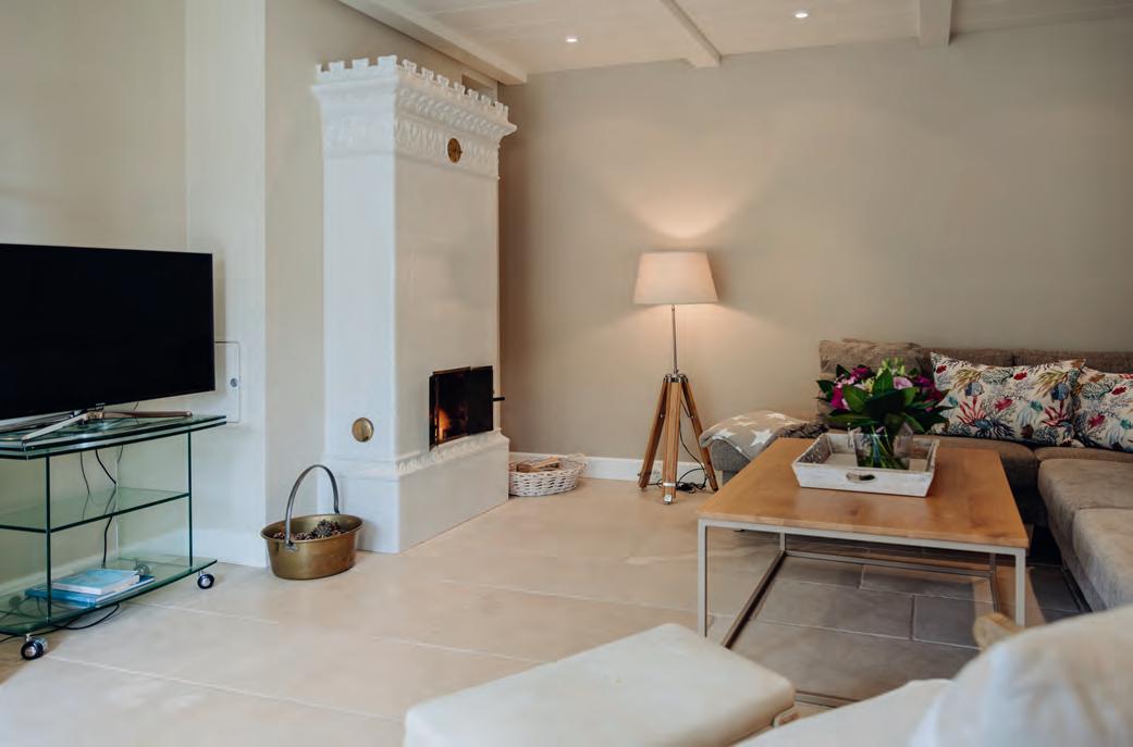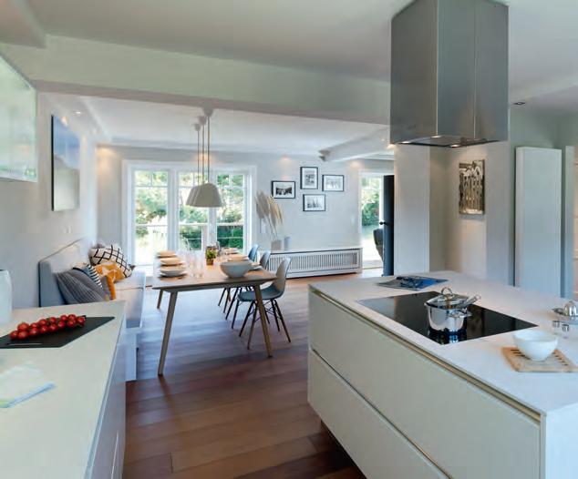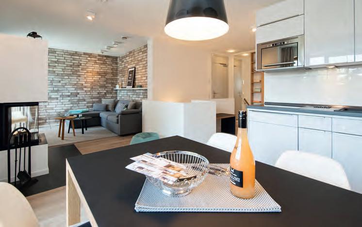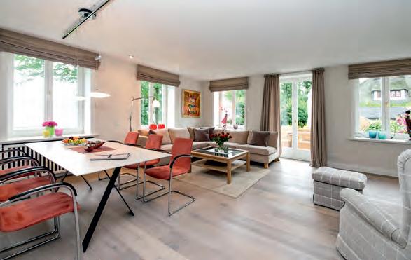zu acht Gästen Platz, besticht u a. durch hohe Decken sowie bodentiefe Fenster. So wurde ein besonders freies Raumgefühl geschaffen. Hier trifft Tradition auf Moderne – außen friesische Gemütlichkeit, innen spannendes Design auf höchstem Niveau. Das schöne, zeitgemäße Interieur begeistert mit Werken namhafter internationaler Designer, mit interessanten Lichtobjekten und farblich wunderbar harmonierenden Stoffen. Jedes noch so kleine Detail, jedes Accessoires ist bis ins Kleinste durchdacht. Der Mittelpunkt des Hauses ist der luxuriöse Wohn-/Essbereich. Hier lädt eine hochwertige Sitzgarnitur zum Verweilen ein. Während der kalten Jahreszeit sorgt ein loderndes Feuer im schwebenden Kamin für heimelige Atmosphäre. Ein optisches Highlight: die Swingseats! Hobbyköche freuen sich über die voll ausgestattete integrierte Gourmet-