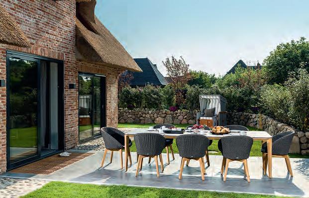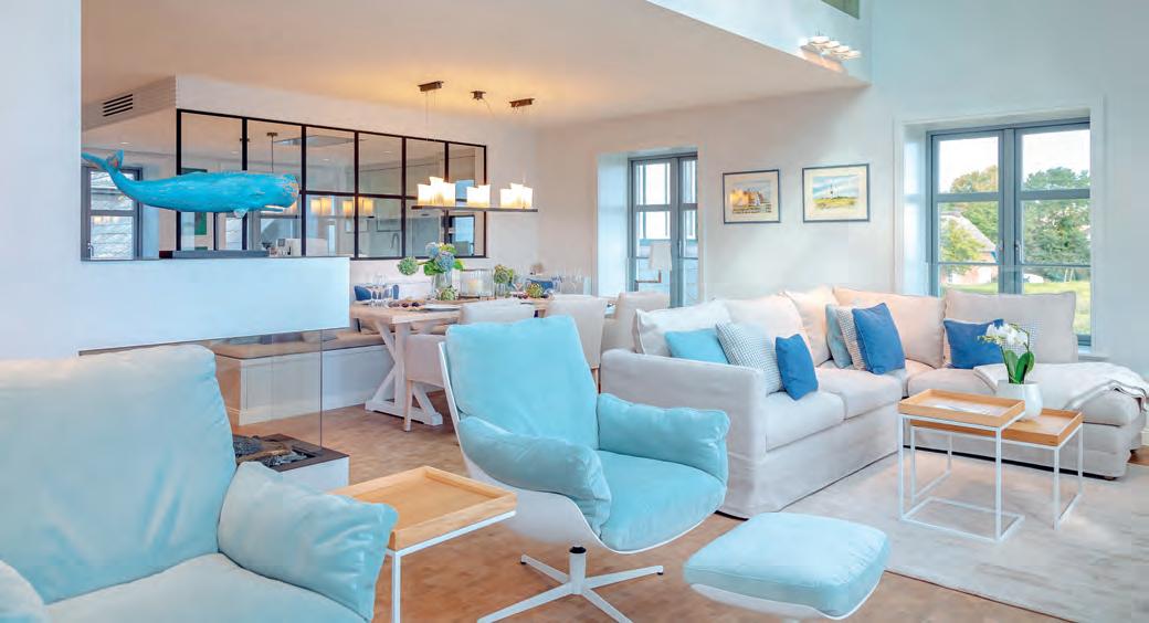 Susanne und Oliver Suchy haben drei Leidenschaften: herzliches Gastgebertum, individuelles Interieur und die Insel Sylt. Seit vielen Jahren steht das sympathische Ehepaar mit seinem Unternehmen Höpershof im niedersächsischen Wedemark für maßgeschneiderte Wohnund Einrichtungskonzepte, hat sich weit über die Grenzen der kleinen Gemeinde hinaus einen Namen gemacht und begeistert auch auf Sylt mit einem exklusiven Showroom. „Sylt ist keine Destination, Sylt ist eine Lebensart“, erklären Susanne und Oliver Suchy lächelnd, bieten darüber hinaus auf ihrer Lieblingsinsel, die ihnen längst zur zweiten Heimat geworden ist, ausgesuchte Feriendomizile an. Ob in Westerland, Wenningstedt, Keitum, Rantum oder Hörnum, ob kuscheliges Appartement für zwei Personen oder ein großzügiges Domizil für die ganze Familie –jedes „Zuhause auf Zeit“ präsentiert sich als wunderbare Wohlfühloase, deren Einrichtung die stilsichere Handschrift der beiden erfolgreichen Interieur-Experten trägt. Zu den absoluten Wohn-Highlights zählt das Ferienhaus KEY West in Westerland, nur 600 Meter vom Strand entfernt. Es wurde im Sommer 2020 fertiggestellt, setzt neue Maßstäbe im Luxusferienhausbereich. Das Refugium unter Reet (250 Quadratmeter Wohnfläche) bietet bis