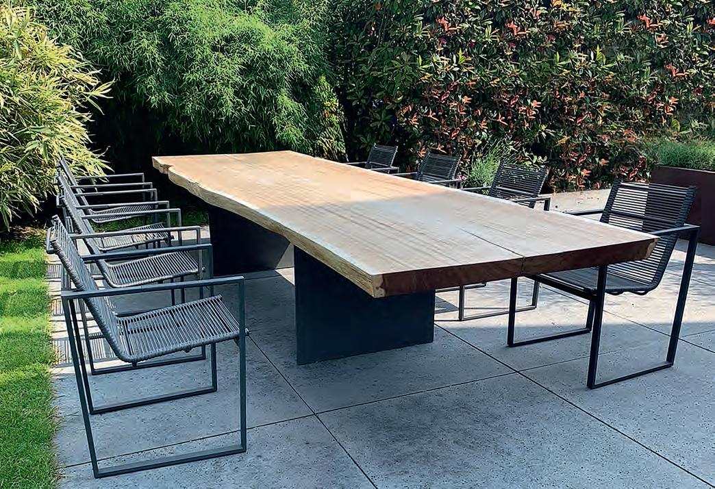 tät zu Holz und habe früher auch als Restaurator gearbeitet. Unsere neue Edition Massivholztische ist mir sehr wichtig. Kein anderes Möbelstück hat in unserem täglichen Leben einen so zentralen Stellenwert wie der Esstisch. Hier setzt unsere Edition an“, erklärt der 58-Jährige. Massivholzbohlen und Tischplatten aus einem Stück, erlesene Stammware und Plattenstärken von bis zu sieben, acht Zentimetern. Eine solche Qualität ist natürlich nicht nur für den Außen-, sondern auch für den Innenbereich geeignet. Jeder Tisch, ganz nach Wunsch mit und ohne Baumkante, ist ein Unikat. Er hat seine ganz eigenen charakteristischen Merkmale und seine eigene Geschichte. Und die beginnt mit einem Baum.