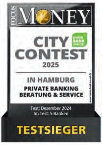 Und für diesen Service ist das Haspa Private Banking bereits mehrfach ausgezeichnet worden. Unter 372 Finanzdienstleistern wurde die Vermögensverwaltung der Hamburger Sparkasse auch 2025 vom Handelsblatt und dem Elite Report in München wieder zum „Besten Vermögensverwalter im deutschsprachigen Raum“ gewählt – eine Bestätigung für den hohen Qualitätsanspruch und für die exzellente Beratungskompetenz. Ebenfalls von den Leistungen überzeugt werden konnte das Institut für Vermögensaufbau (IVA), das den Finanzexperten im „Focus Money CityContest“ im Bereich Beratung und Service jeweils zum Testsieger kürte. ■
