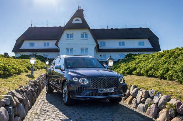 orten in Deutschland und einer Dependance in Zürich, Partner von Luxus-Automobilen wie Bentley, Bugatti, McLaren, Porsche und Rolls-Royce. Eine Kooperation besteht auch u.a. mit dem Fünf-Sterne-Luxushotel Söl’ring Hof auf Sylt. „Es ist eine Partnerschaft auf Augenhöhe. Auf Wunsch werden die Gäste des Hauses, von denen ebenfalls viele zu unseren Kunden zählen, mit einem Bentley Flying Spur Azure V8 abgeholt. Sie genießen bereits auf der Fahrt nach Rantum einzigartigen Komfort und die beruhigende Atmosphäre einer hochklassigen Luxuslimousine. Es ist ein wirklich bemerkenswertes Fahrzeug. Die glänzenden vertikalen Chrom-Finnen des Kühlergrills sind ein echter Hingucker, im Innenraum trifft traditionelle Handwerkskunst auf moderne Technologien. Unter der Motorhaube mit 550 PS steckt der neue High Performance Hybrid-Antriebsstrang von Bentley. Damit liefert das Fahrzeug die Leistung eines V8-Benzinmotors, kombiniert mit reduzierten Emissionen und einem sanften, nahezu geräuschlosen Fahrerlebnis bei reinem Elektroantrieb“, erklärt Roman Pöppe. ■