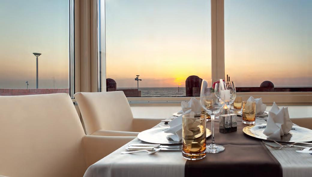 Kulinarische Attraktion auf Norderney: das Gourmetrestaurant N’eys im Wintergarten mit dem wohl schönsten Meerblick. In der Bar und Lounge sorgt die maritime Atmosphäre für entspannte Stimmung.