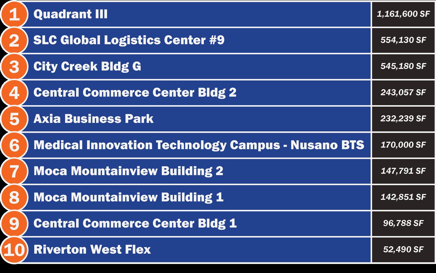 Utah County closed the quarter with 2, 994, 737 square feet of industrial construction underway, compared to 2,248,289 square feet last quarter and 3,775,820 square feet at the same time last year While several projects in the planning stages will eventually increase market inventory, reflecting growing confidence, construction is not expected to begin until early 2025. Developers are closely tracking market conditions and will move forward when pre-leasing activity, land costs and construction expenses are more optimal to ensure future projects are sustainable
