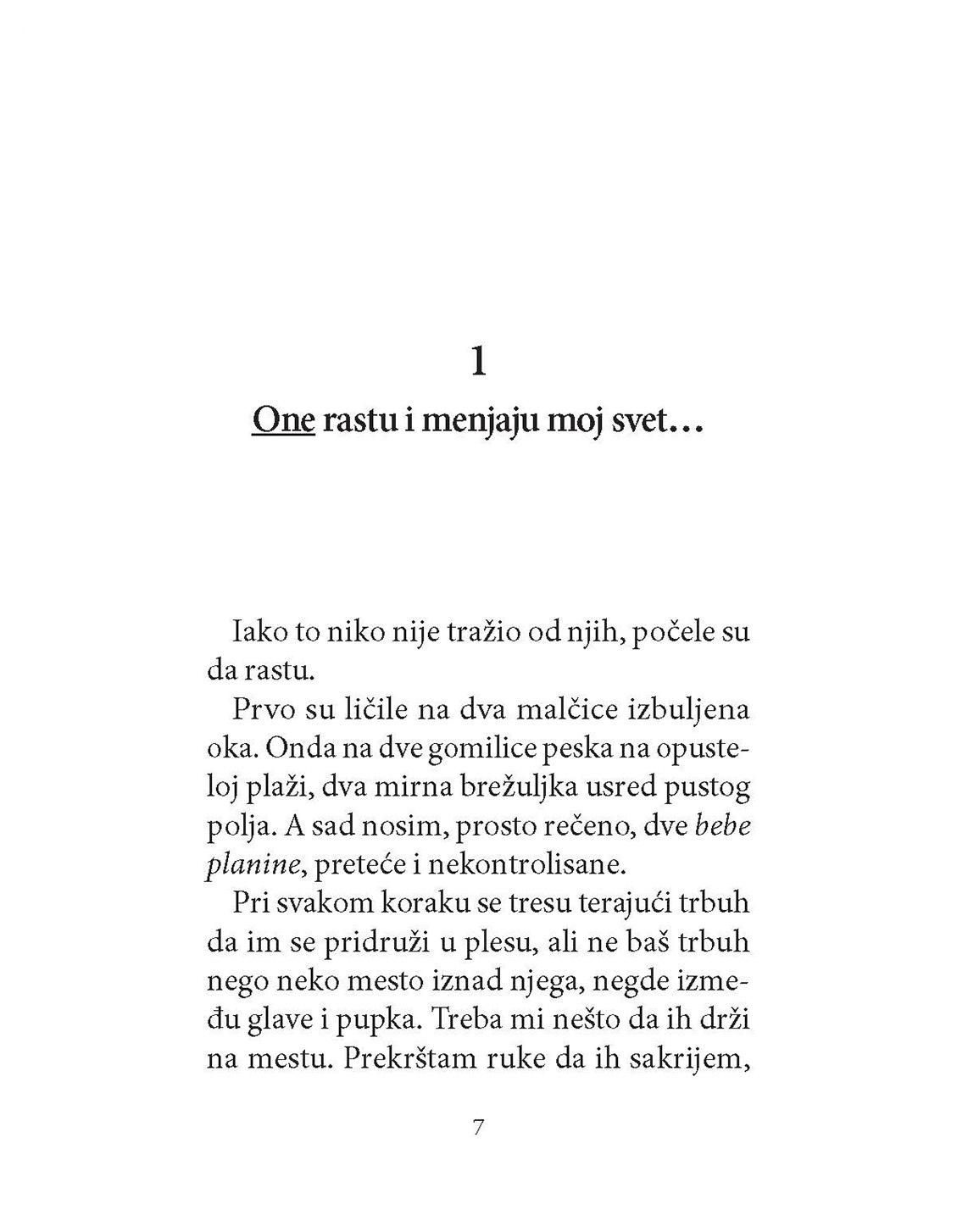 "Prekrštam ruke da ih sakrijem, ali brzo shvatam da se ne može živeti s neprestano prekrštenim rukama. Zato nosim široke tatine košulje, povijam leđa, nadvijam glavu nad grudi, činim sve ne bih li prikrila tu neželjenu promenu.“