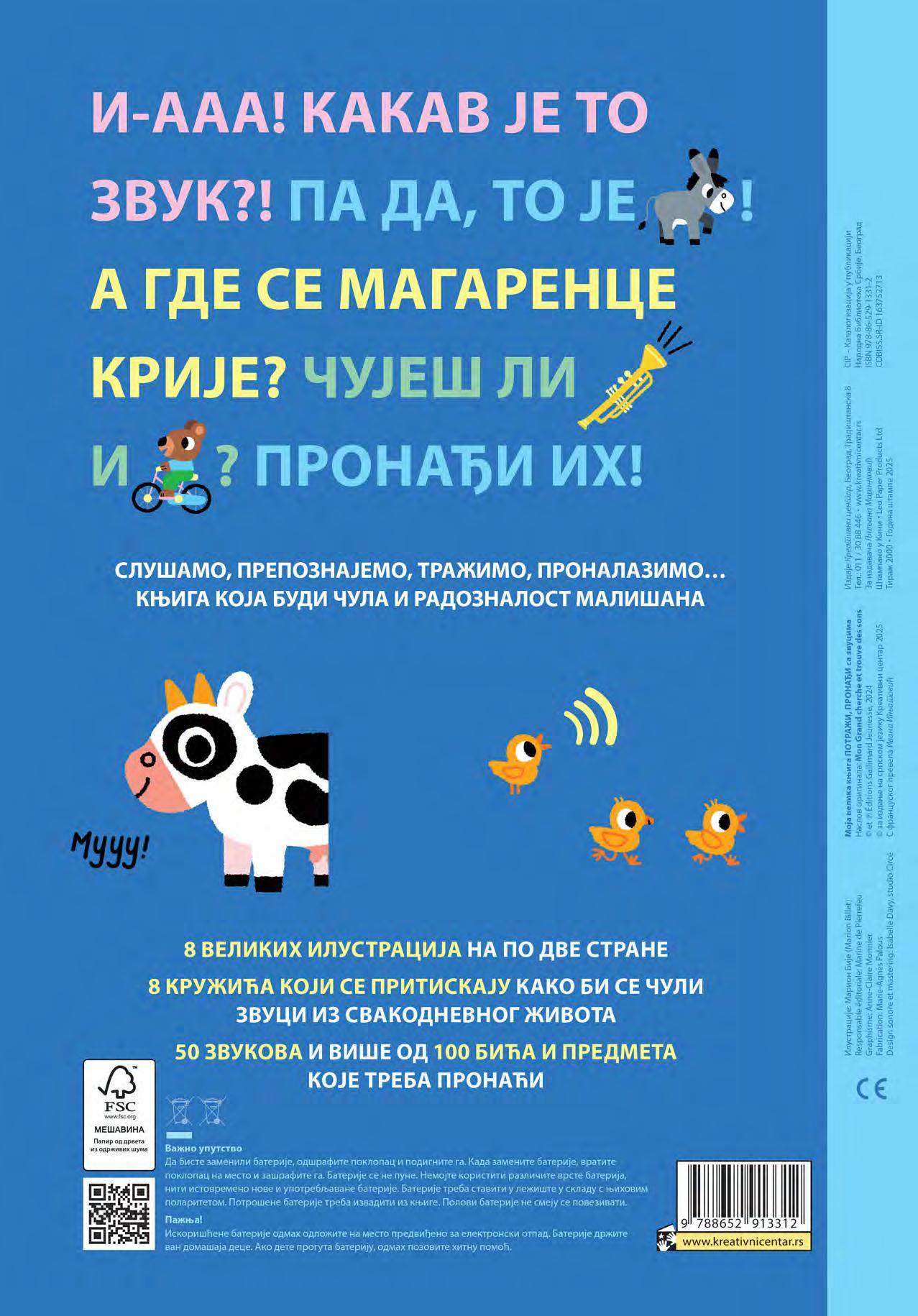 U ovoj velikoj knjizi sa zvucima nalazi se osam ilustracija na po dve strane, sa osam kružića iza kojih se kriju zvuci iz svakodnevnog života a bliski su iskustvu najmlađe dece. Knjiga koja budi čula i radoznalost mališana. Pomoću 50 različitih zvukova i puno prelepih ilustracija Marion Bije, deca imaju mogućnost da POTRAŽE i PRONAĐU više od 100 bića i predmeta, otkrivajući svet i učeći nove reči.