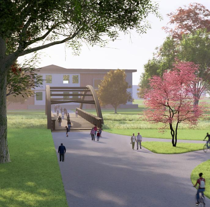 Rendering showing the desired scale and character of the proposed new Recreation District, connected with walking paths and bike trail.
