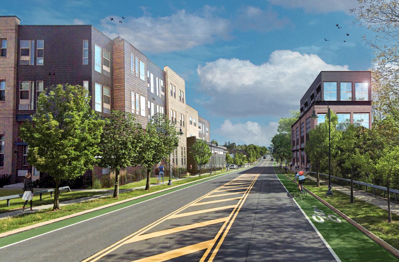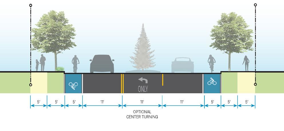 • Implement traffic calming via a “road diet” including smaller lane and pavement widths and increased space for pedestrians and bicyclists