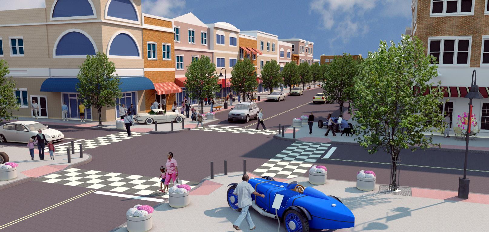 • Enhance the architectural quality of the dowown. Home to Watkins Glen International, one of the conceptual designs explored utilizing a raceway theme as part of the downtown streetscape.