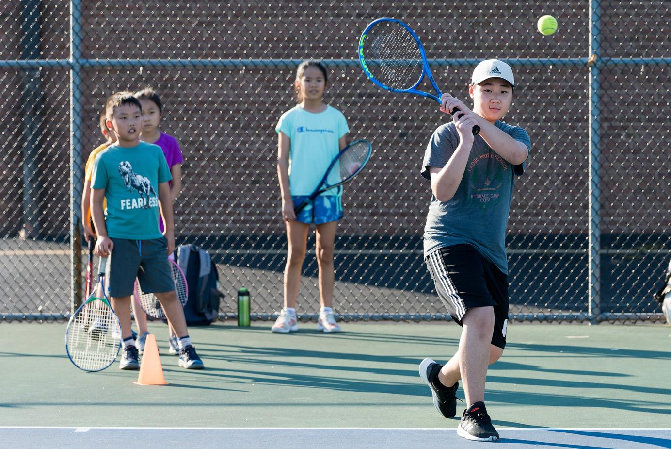 TOP RIGHT: Gladson teaches Halle Tatum (9) how to serve a volleyball at the open gym. The practice was held for all who were wanting to try out for the Ladue team. “I got closer with my friend Maggie on the highschool team through volleyball, and then I have other people who I played with for like 3-4 years,” Gladson said.