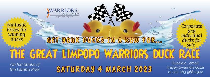 Every business involved in the Great Limpopo Warriors Duck Race received a large wooden Duck Mascot which they were charged with decorating and displaying. The mascots are on display in the business premises and visitors are encouraged to vote for the ducks by placing a R5 coin into the bucket the mascot is perched upon. The mascot with the most votes wins. There will also be a duck parade at Lifestyle Centre before the race where the public can vote for their favourite.