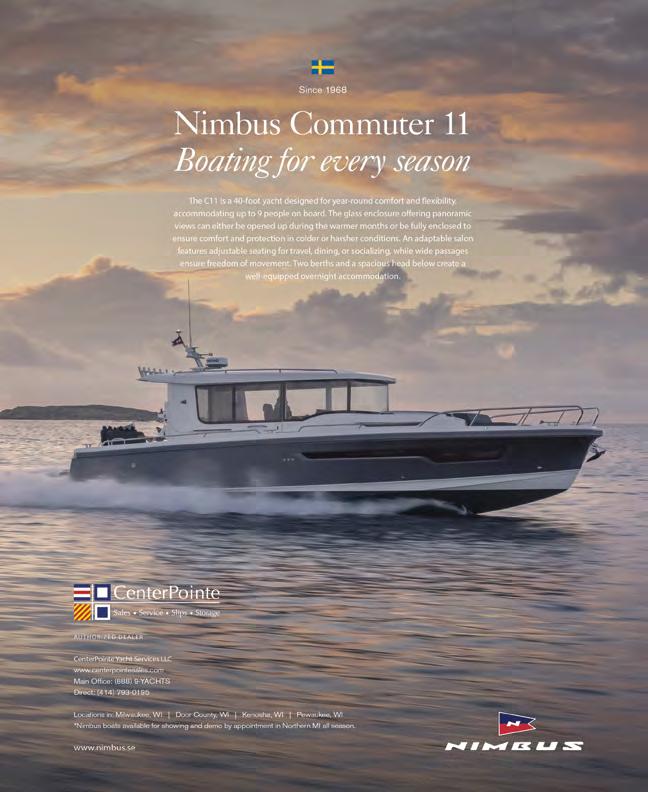 Lakeland Boating (ISSN 0744-9194) Copyright 2024, by O’Meara-Brown Publications, Inc. is published eleven times per year (except December) by O’Meara-Brown Publications, Inc. / Business/Accounting and Editorial Offices: 1555 Sherman Ave. Suite 313, Evanston, IL 60201, 312-276-0610. / Call 847-504-8475 to subscribe. Lakeland Boating, P.O. Box 386, Lincolnshire, IL 60069 (U.S.). Annual subscription rates: United States: $24.95 per year; International and Canadian: $39.95 per year, includes 7% G.S.T. tax (G.S.T. 894095074-RT 0001) and $12 postage included. Single copies are $4.99 for U.S. and Canada. Only U.S. funds are accepted. Periodical postage paid at Evanston, IL and additional mailing offices. / POSTMASTER: Please send address changes to Lakeland Boating, P.O. Box 386, Lincolnshire, IL 60069. / Lakeland Boating is a registered trademark of O’Meara-Brown Publications, Inc., Evanston, IL. Published as Lakeland Yachting 1946-1955. / Unsolicited work may be submitted at the creator’s own risk. Lakeland Boating assumes no responsibility or liability for unsolicited material. All submissions must be accompanied by a selfaddressed envelope with sufficient return postage. / All published photos are courtesy of the manufacturer, unless otherwise noted.