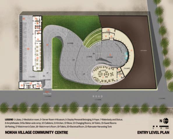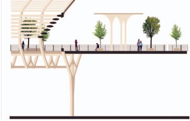 accessed from anywhere in the surrounding area. In order to realize this highly connected public space within the city, circulation routes were planned that naturally led foot traffic to the rooftop park. With two pedestrian bridge connections, a bridge that straddles the road at third story level and an accessible open mall, this four-storied urban amenity has been well integrated into the urban infrastructure of the city.