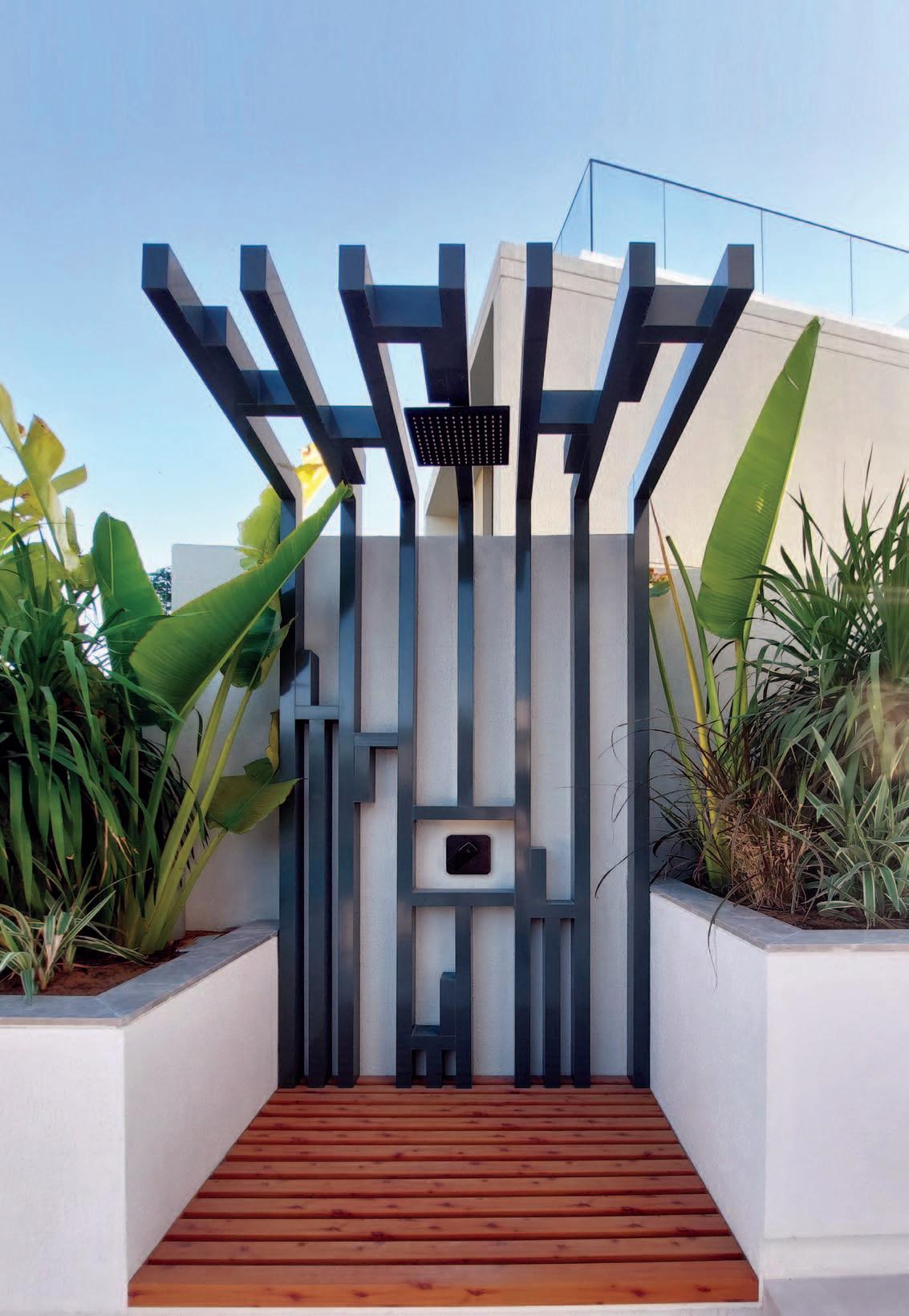 of a lush planter box, as well as an outdoor shower which has a similar design to the pergola. To the left of the garden there is an overflow infinity pool, which has been personalised with engraved tiling, and framed by water falls rising from the perimeter planter box. A second pergola with vertical strip lights is placed on the back wall to provide shade for a raised platform area, which offers guests a seating and sunbathing area.