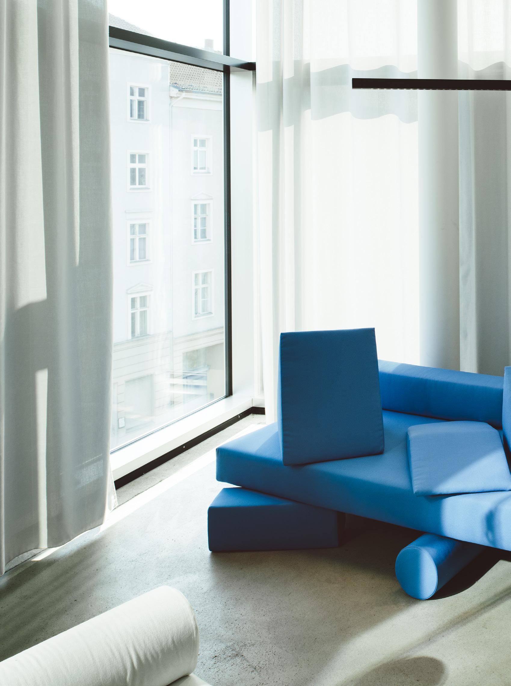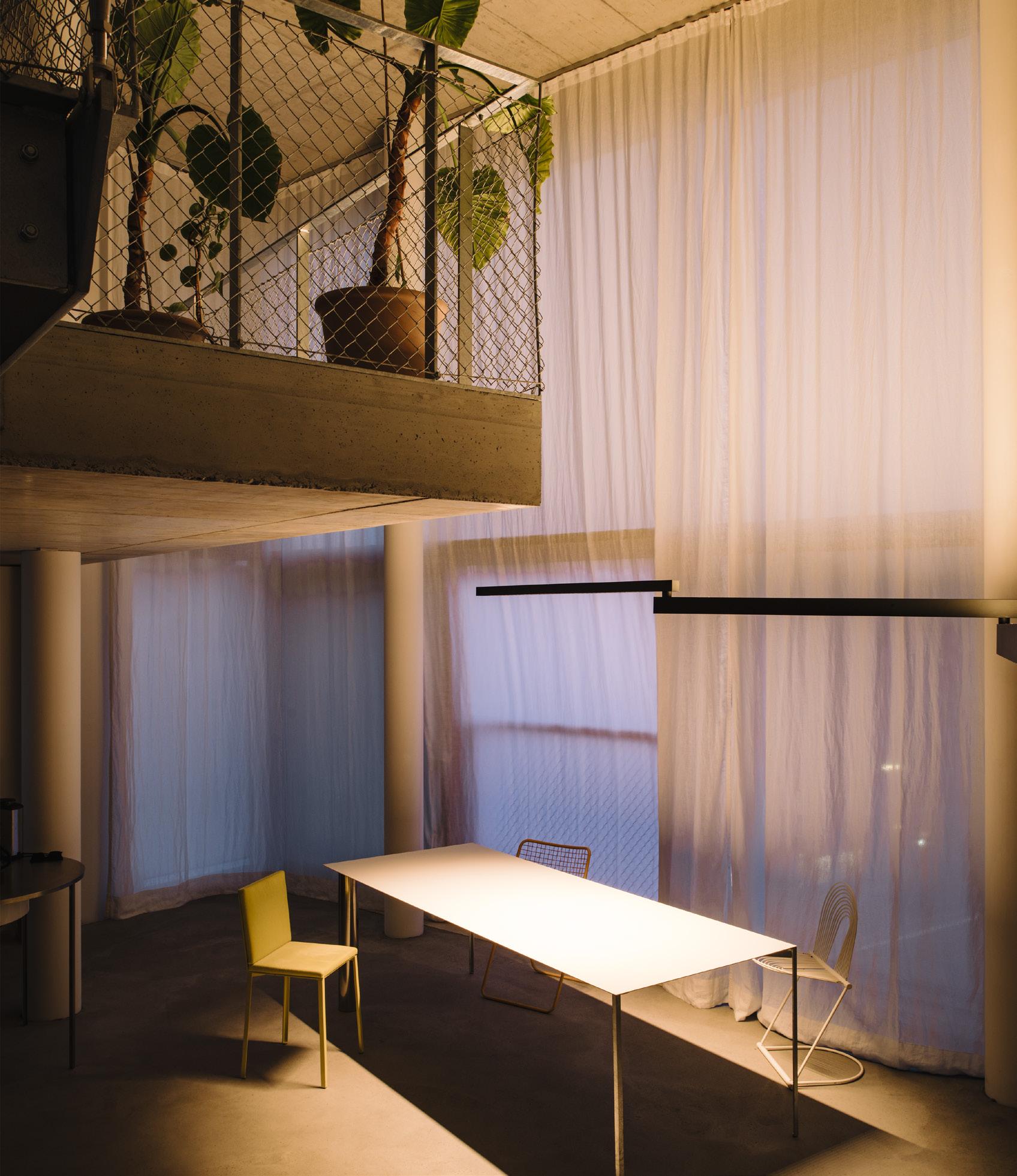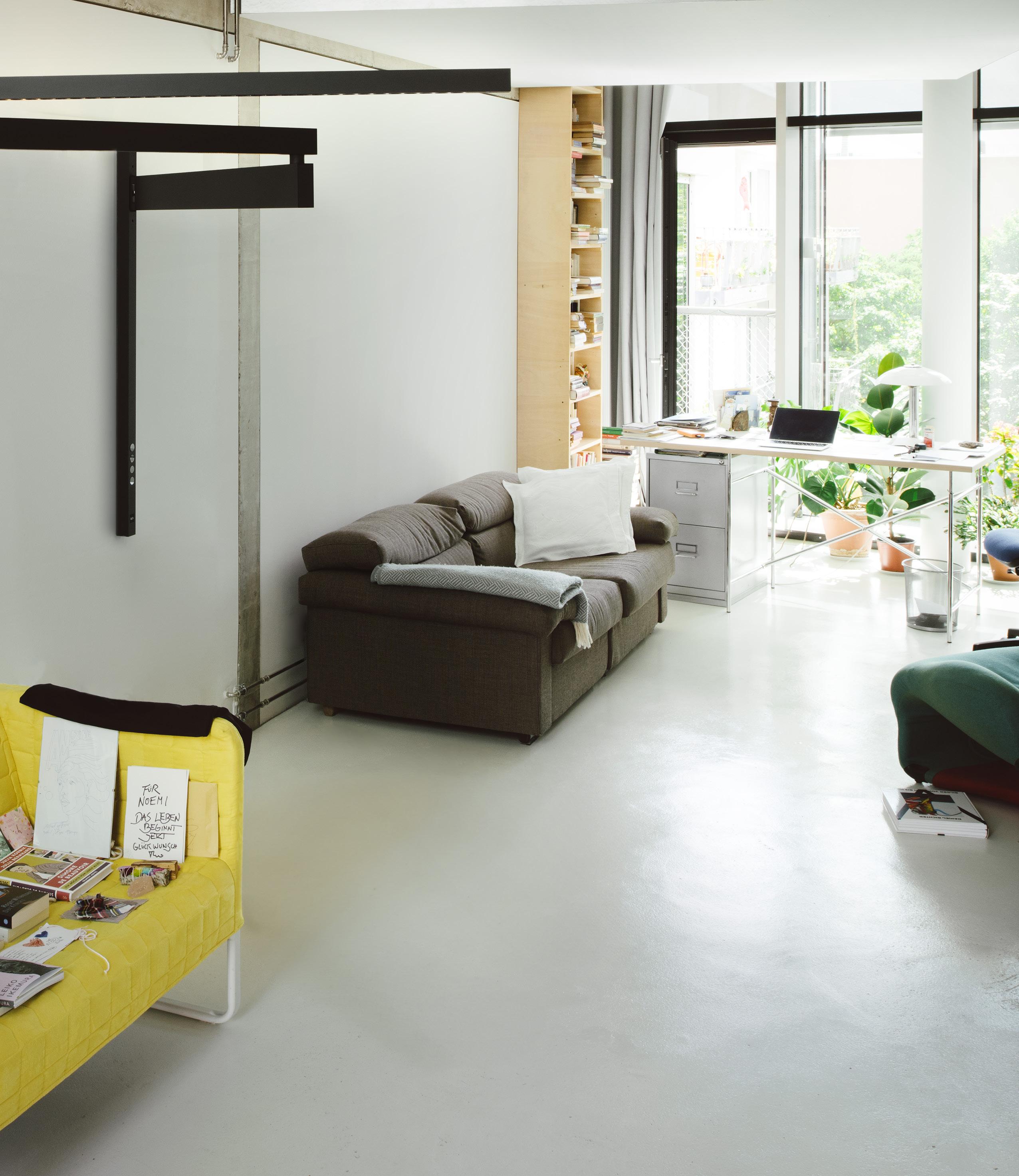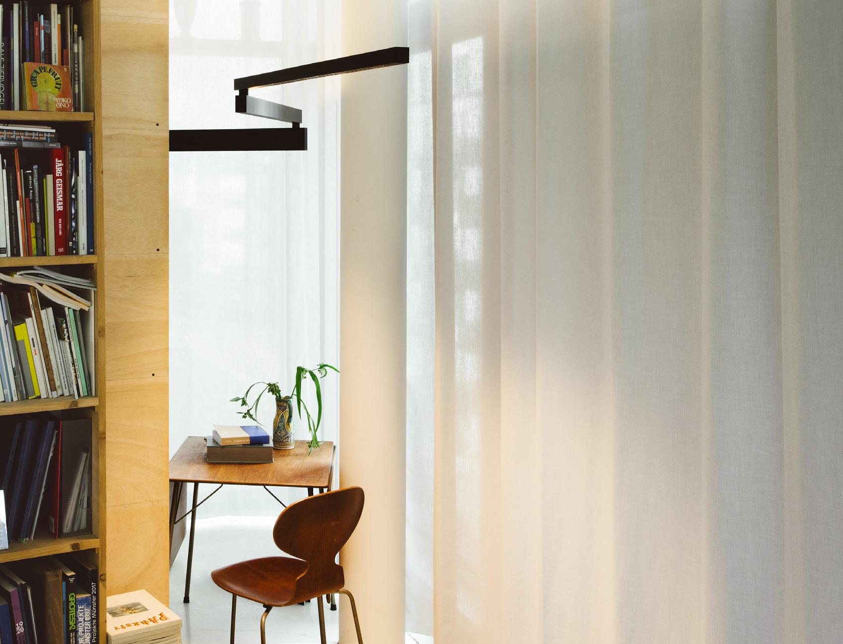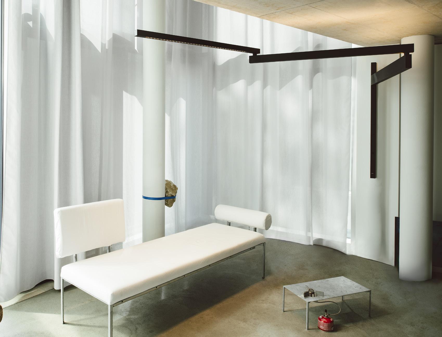 Art critic Noemi Smolik was looking for a loft space in Berlin when she came across the group’s project and joined in. ‘In my apartment, I don't have many objects: a table for writing, a dining table in the kitchen where I host my friends, and a place where I can sit down and read. I asked Sam to build me a mezzanine for my bed.’ In her apartment, Black Flag is able to illuminate the entire space in a few sweeping gestures, from sneaking over the dining table to reaching over the bookcase and reading corner.