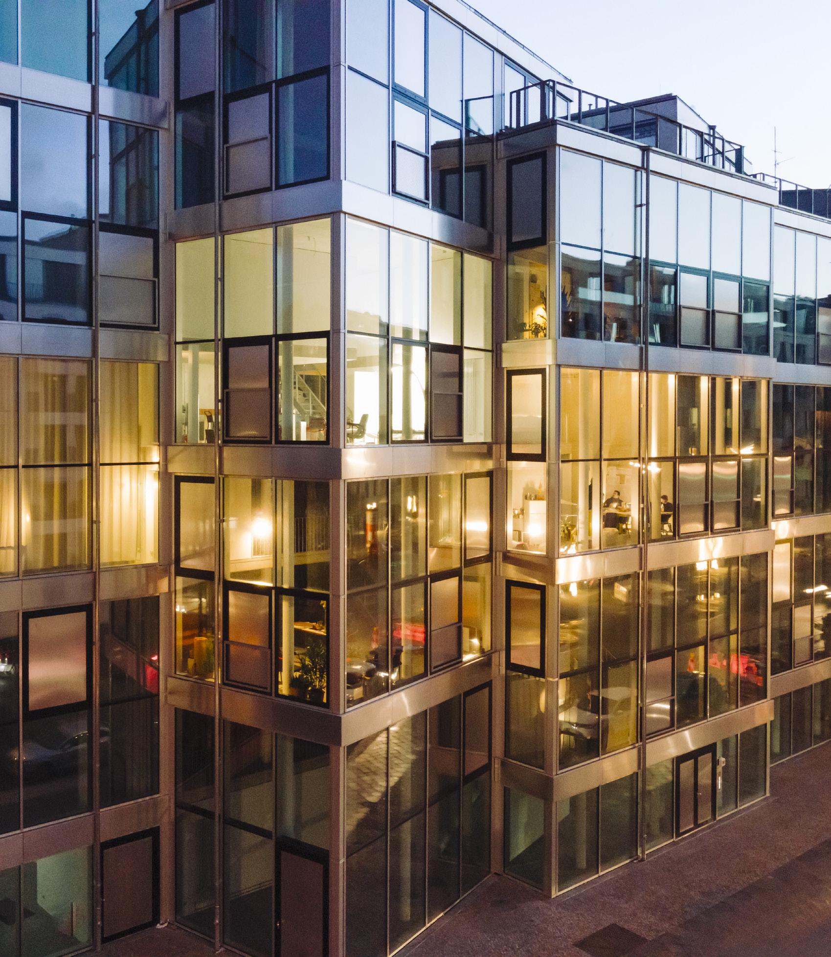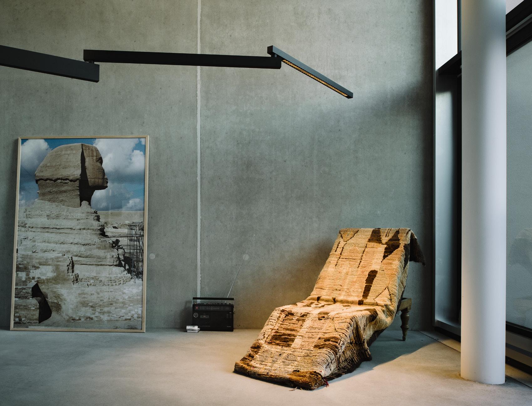 ‘All the internal boundaries of my house are really flexible,’ says Sam Chermayeff, who worked on the building as part of architectural practice Meyer-Grohbrügge & Chermayeff. Conceived by a group of like-minded individuals, the building consists of six asymmetric towers with glass facades. ‘Rooms are not rectilinear, they’re folding into each other and are able to accommodate different situations. You start out with a flexible space and then change it over time. The home gets a little bigger when you have neighbours suddenly present. It allows for a slightly expanded field of home. I like that Black Flag can expand in its own field: at first, you can just illuminate a wall, or a small corner, but you can also make a bigger space. The way it grows, that works really well here’.