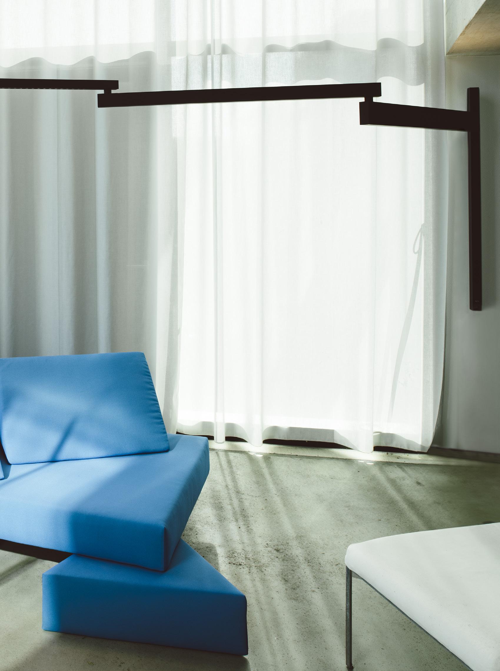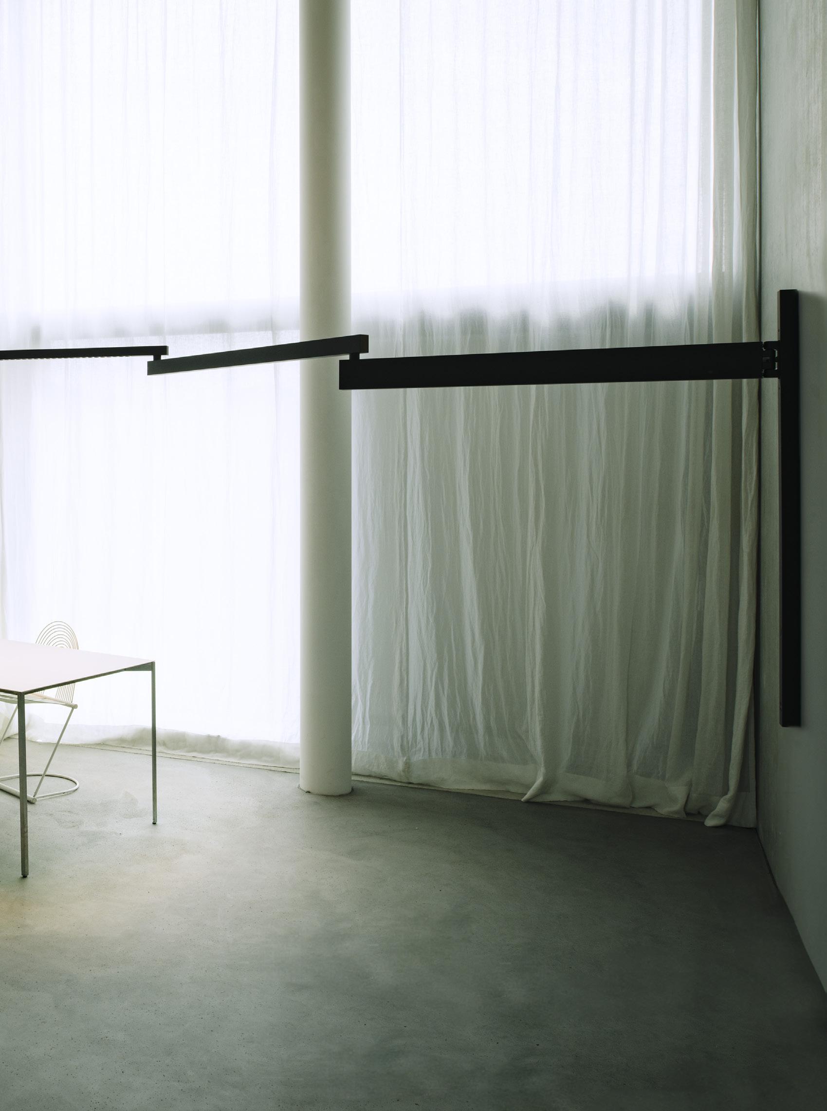 KONSTANTIN GRCIC One application would be a space within which different things happen depending on the time of the day. So the lamp moves along with you and your activities, from being the lamp on the desk where you work to being the lamp over the kitchen to cook, over the table to eat and then to the sofa to relax. A radius of activities within a space. Another scenario would simply be a large space, with only a few objects holding the strength of such a space. Sometimes you have big spaces and the lamps simply get lost –Black Flag is strong enough to hold a big environment.