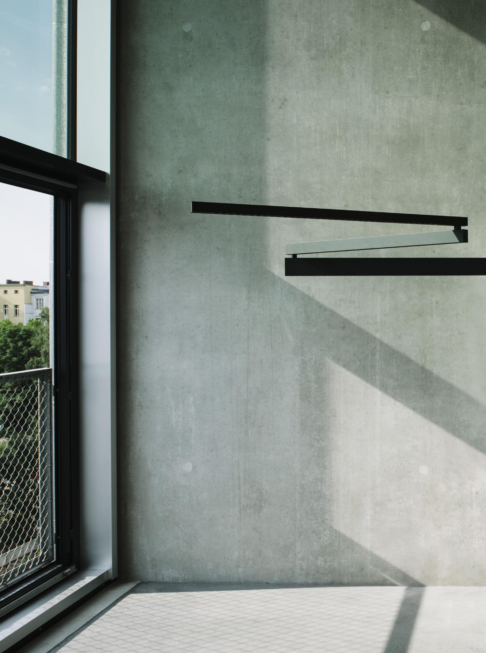 Berlin’s Kurfürstenstraße 142 is a communal living concept that redefines the idea of home for the 21st century. Inside, spaces merge, each double-height unit varying in size and interconnected with its neighbours. In this ecosystem of domestic architecture we test the possible applications of Black Flag, Konstantin Grcis’s latest design for Flos. An exercise in the way minimalism combined with technology reinvents functionality, Black Flag is an extendable wall light that offers flexibility of illumination thanks