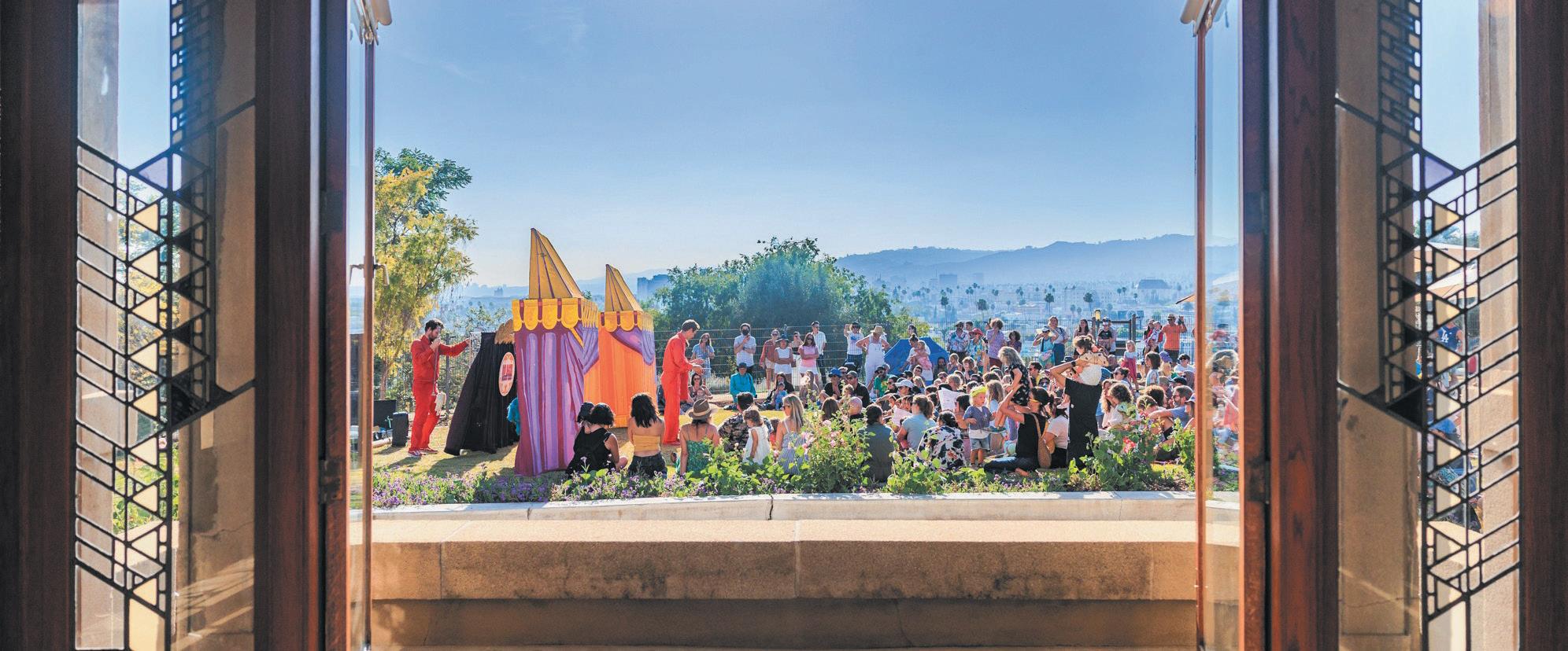 FRANK LLOYD WRIGHT’S leaded windows of the Hollyhock House frame a puppet performance on the west lawn. Photo by Paul Cozzi, Courtesy of City of Los Angeles Dept. of Cultural Affairs