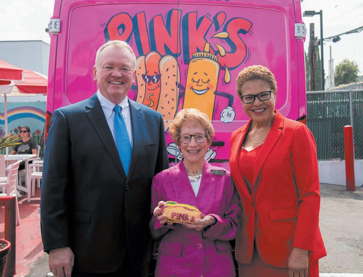MAYOR KAREN BASS with her pick for Los Angeles police chief, Jim McDonnell, and Beverly Pink-Wolfe at the legendary Pink’s hot dog stand.