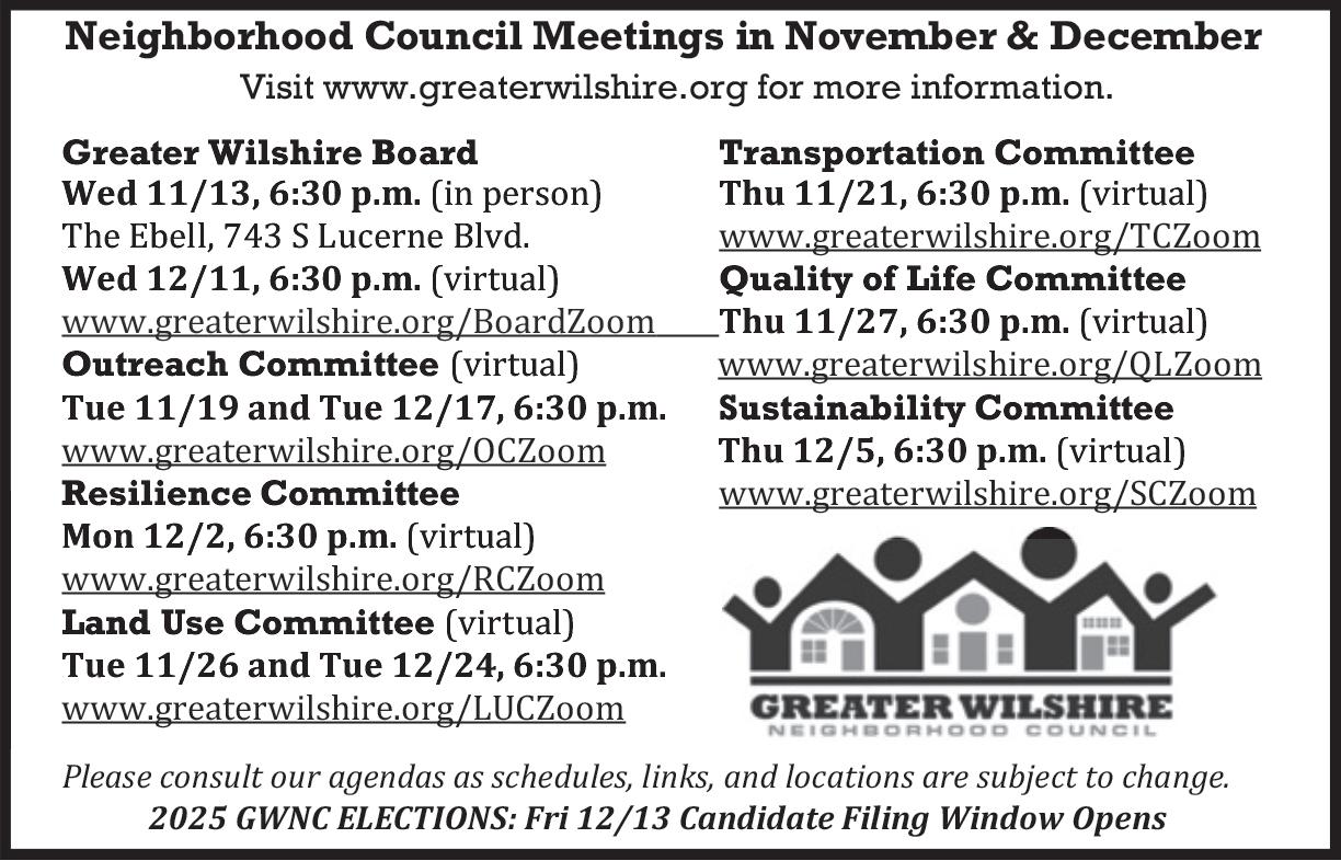 Wed., Nov. 13 — Greater Wilshire Neighborhood Council board meeting via Zoom at