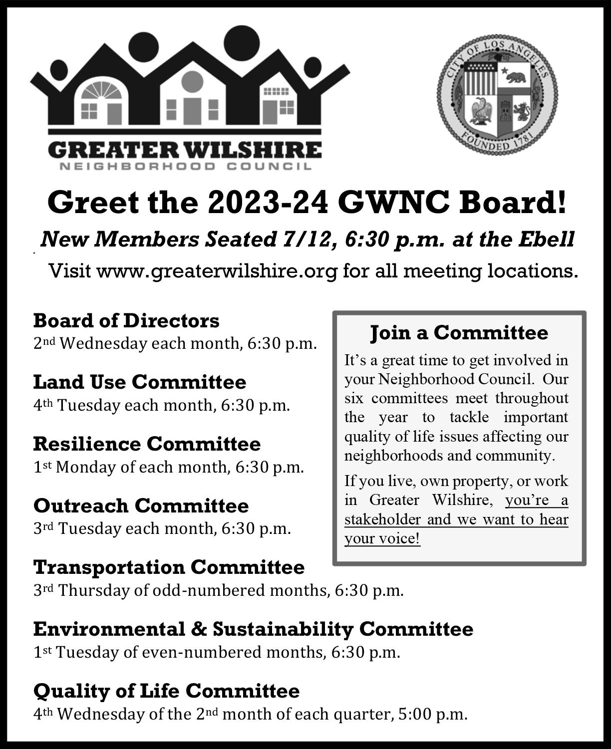 Wed., July 12 — Greater Wilshire Neighborhood Council board meeting, 6:30 p.m. at the Ebell of Los Angeles at 743 S. Lucerne Blvd. See greaterwilshire.org.