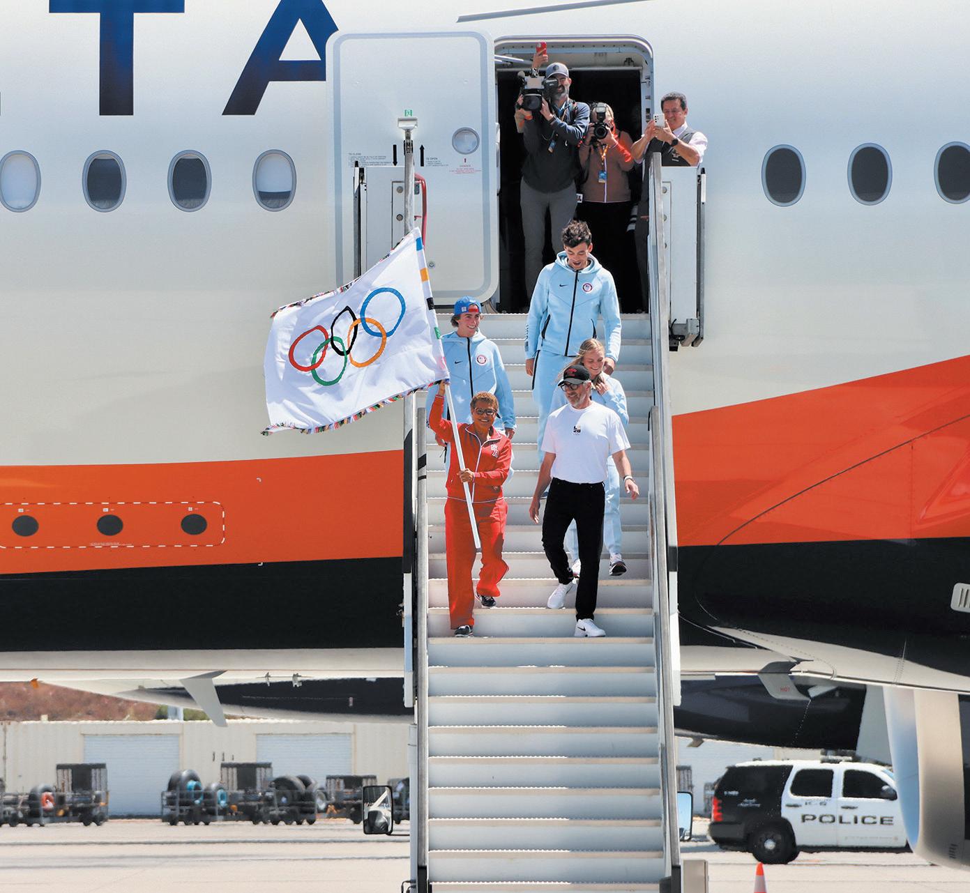 FLAG arrives with Mayor Karen Bass, LA28 Chair Casey Wasserman and three of the Team USA Olympic athletes, all having returned on a special flight from Paris on August 12.