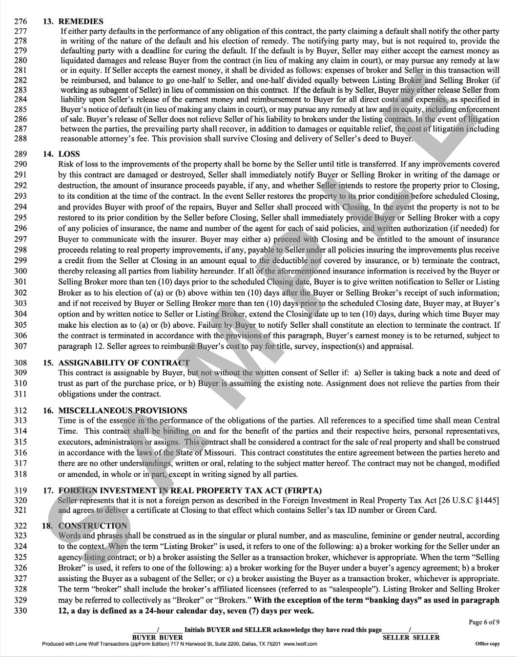 The Residential Sale Contract is a preprinted form, approved by Counsel for the St. Louis Association of Realtors and by the Bar Association of Metropolitan St. Louis. This instrument sets forth all the terms and conditions of the purchase/sale.
