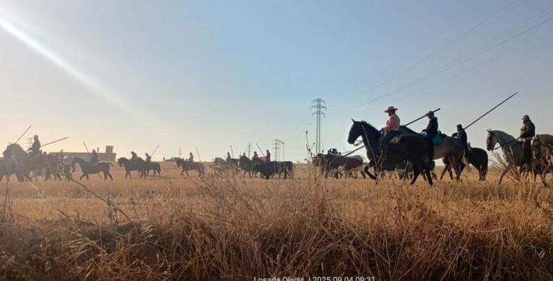 Un numeroso grupo de jinetes, coordinados por Pedro Caminero, se encargó de conducir al conjunto hacia la villa. En la salida, los novillos se desviaron inicialmente hacia el mirador de los coches, en la zona conocida como la casa de Zaera. Desde allí, los caballistas lograron encauzar al grueso hacia la cañada, con los bravos abriendo camino hasta el cruce de cuatro caminos, punto en el que la manada se fragmentó: un toro se