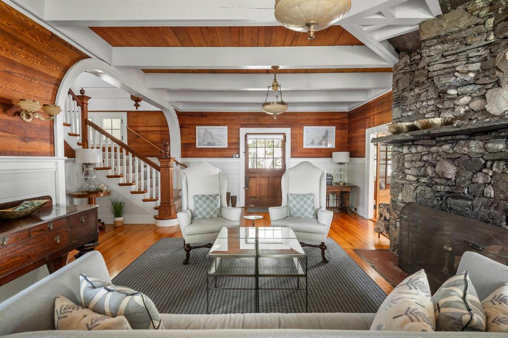 Embrace the serene elegance of Rockcraft Lodge, a magnificently renovated historic residence, nestled along 850 feet of the pristine Western shore of Sebago Lake. The home’s meticulous restoration harmonizes luxury with classic grandeur, showcased by the stunning stone masonry and dual fireplaces that anchor the main living space, paying homage to the lodge’s namesake.