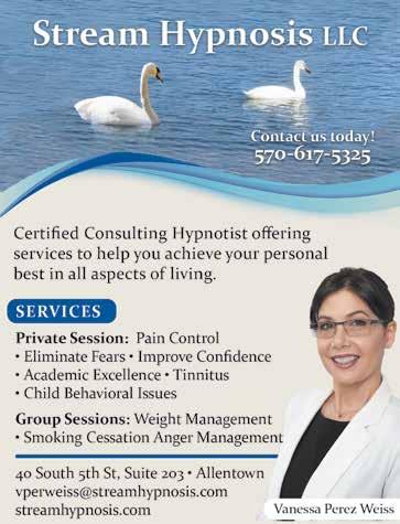 For more information, Vanessa Perez Weiss, BCH, FNP, NP-C. Stream Hypnosis, LLC, 535 E. Laurel St, Bethlehem, PA 18018. 570-617-5325, vperweiss@StreamHypnosis.com, www.StreamHypnosis.com. See ad on page 8.