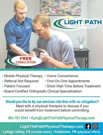 For more information, Kyle S. Kasman, PT, DPT. Board-Certified Orthopedic Clinical Specialist. 484-781-5341. Kyle@LightThePathPhysicalTherapy.com. See ad on page 4.