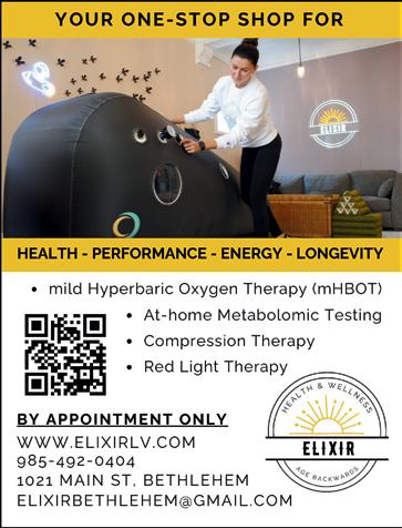 Elixir Health & Wellness is an east meets west, holistic approach for longevity and anti-aging. We offer mild Hyperbaric Oxygen Therapy (mHBOT), Red Light Therapy, Compression Therapy, and Metabolomic testing. These can be combined to optimize health or be used as stand alone therapies for specific goals. Protocols are tailored to each individual client. See ad, page 14.