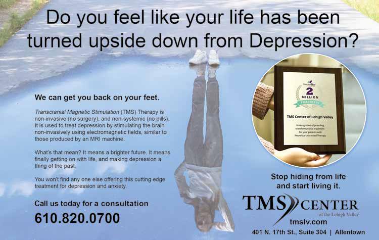 Thousands in the Lehigh Valley struggle with depression every day, but thanks to the TMS Center of the Lehigh Valley, they are not alone in their fight. We are the region’s first transcranial magnetic stimulation (TMS) treatment facility and one of the most experienced centers on the east coast, having performed over ten thousand TMS treatments. See ads, pages 15.