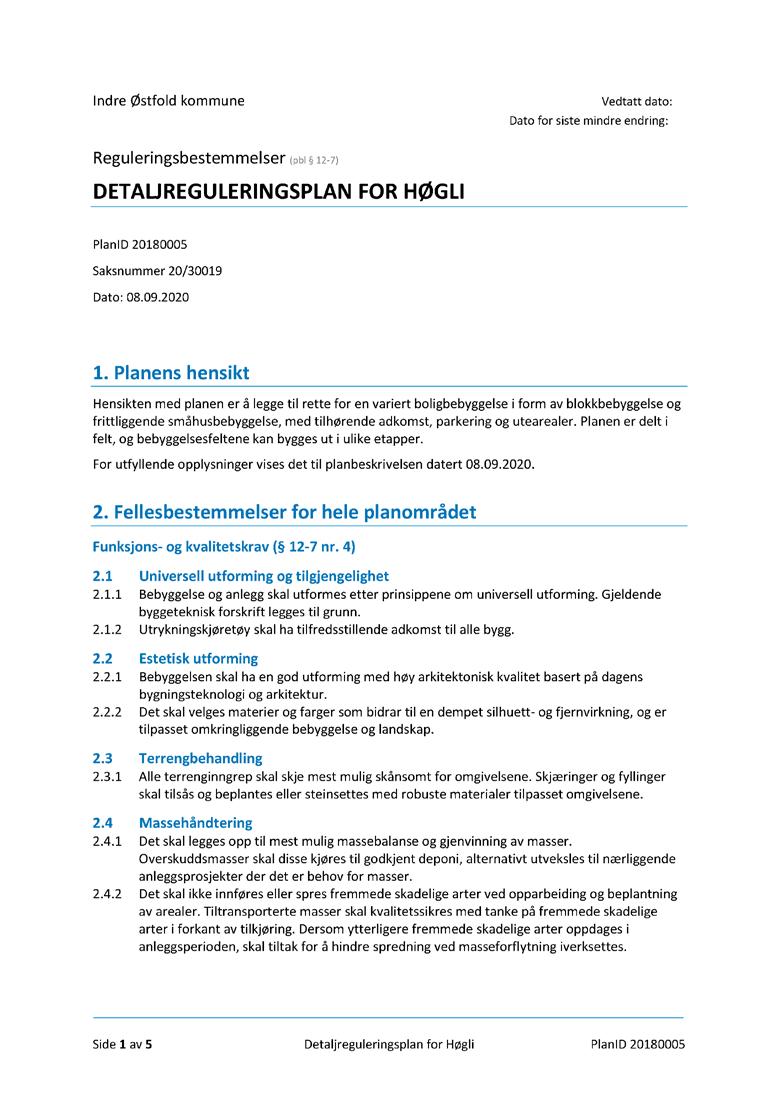 Prosjektet ligger innenfor reguleringsplan for Høgli, vedtatt 08.09.2020. Rammesøknad er sendt til behandling. Selger tar forbehold om at rammetillatelse og nødvendige igangsettingstillatelser innvilges av Indre Østfold kommune.