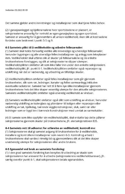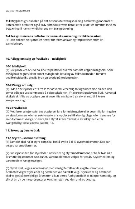 Utkast til vedtekter for sameiet er utarbeidet. Det forutsettes at kjøper aksepterer vedtektene som grunnlag for avtalen. Utkast til vedtekter for sameiet følger vedlagt.