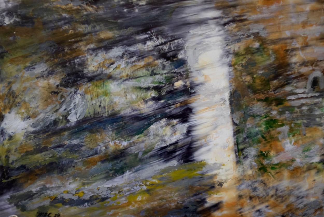 released, creating a sense of freedom and liberation from the enslavement to the “reality” it purports to depict. At the same time, he refuses to let go of that “reality” the photo purports to document, and in the context of memory he maintains a “never forget” commitment. He talks about that as follows: The act of application of paint on the photo is not intended to cover the suffering or memories of what occurred upon the land or to a people. Instead it is intended to highlight all aspects of the consciousness and content, which these places and events engendered in my thoughts and emotions after engaging them through past visits and understandings. Ruins, forests, rivers, and all aspects of natural form and land attract my eye as points of departure and creative discovery. Historic events commend my heart and burn in my consciousness. In every photographic vista layered by pigment, I have amplified a physical erasure by time. The photographic information emerging through veils of pigment is intentional and should act as a reminder of what occurred in these places or to people. Moreover, what we find through the films of pigment dancing with the original details of each photograph provide new possible meanings. Through mediation between static photo and kinetic painting it is my intention to suggest, with paintings on photographs, the possibility for enlightenment, creative mysteries, and new discoveries. Derived from the predicates suggested in these photo paintings, Collins’ larger oil canvases build on the principles established here. Powerful painted imagery is sublimated in layers of thick paint that harken back to the effects emanating from the photo paintings. In both genres, there are distinct and provocative relationships suggested between the physical world and the spiritual, between the “real” and the “abstract.” Always, they emanate mystery and uncertainty. Sublime beauty resides in the opaque. But they demonstrate that, as with all art of the indeterminate, if not all art in general, the unresolved is all the more provocative and the question is more interesting than the answer. And for Collins, it all begins with these photo paintings.