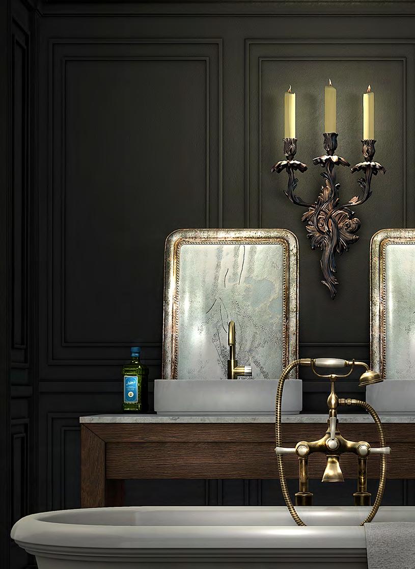 SCONCE + LOUVRE MUSEUM LOUIS XV SCONCE BRASS + NUTMEG COLONIAL BATHROOM TUB W/ TOWEL + FRAMED MIRROR + LUCIE ET LUCIAN RIVE GAUCHE APARTMENT (custom-orders only)