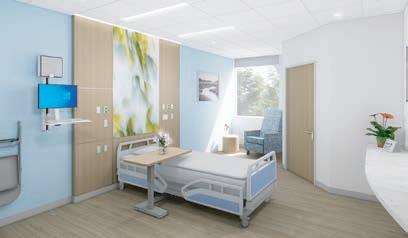 The redesigned emergency department (ED) will occupy the new building’s first floor, and 49 single-patient rooms will occupy the second and third levels. Once completed, 151 of The Miriam’s 247 licensed beds will be private—up from 99 previously. A larger main entrance and new ED walkin entrance are also part of the project, as is a dedicated area for behavioral health patients, an additional ambulance bay, and the relocation of the hospital’s inpatient oncology unit.