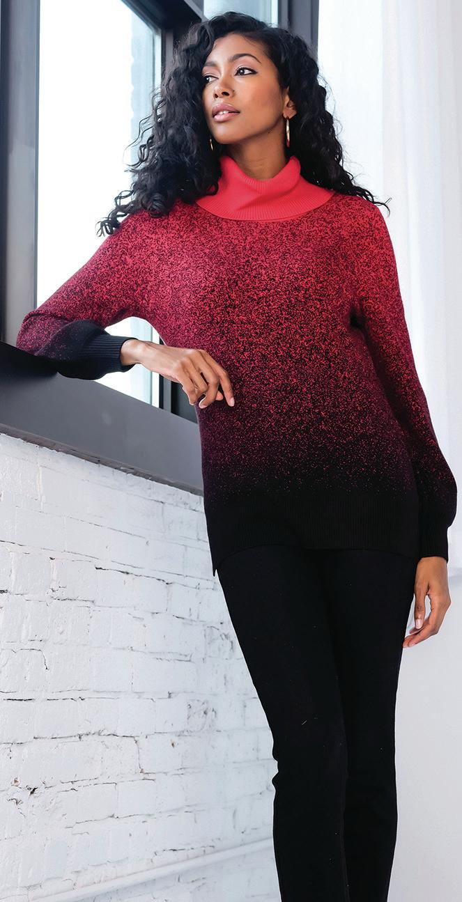 You’ll be cute and comfortable in this argyle red/ivory/black mock neck in viscose blend or a black mix/ mini-stripe knit jacket from Alison Sheri. Both would look great worn with a red knit toque. All items are available at Studio Style. ● FOR MORE INFORMATION