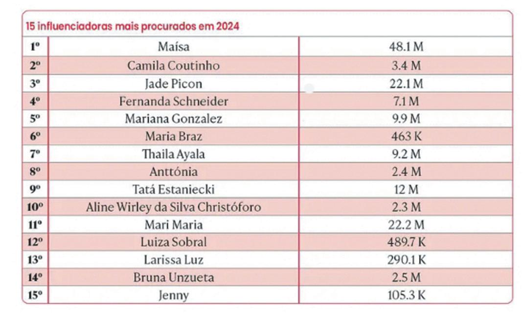 Apesquisa da plataforma Influency.me, divulgada em agosto de 2024, aponta Maísa Silva como a influenciadora mais procurada pelas marcas nos primeiros sete meses do ano. Em segundo lugar está Camila Coutinho, conhecida por seu trabalho como criadora de conteúdo, e, na terceira posição, a influenciadora e atriz Jade Picon. O levantamento revela que, em 2024, 262 mil buscas na plataforma resultaram na inclusão de 13 mil influenciadores em campanhas publicitárias. Curiosamente, todos os 15 influenciadores mais procurados são mulheres. O estudo também indica uma preferência por influenciadores menores, devido a seu engajamento mais robusto e custos mais acessíveis. Em 2024, 66,7% das empresas planejam aumentar seus investimentos em marketing de influência, refletindo um amadurecimento do mercado e uma maior valorização das relações entre marcas e influenciadores.