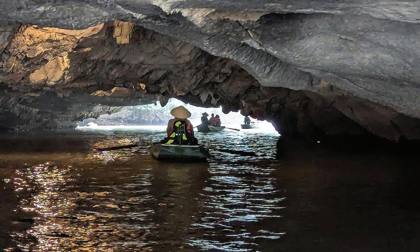 One of the most heavenly experiences in Ninh Binh, Vietnam, is to visit Tam Coc (three caves), a peaceful valley set amid karst hills. Here, we are rowed along a gentle river between paddy fields and through the trio of caves on a traditional wooden boat where the oarsperson paddles using her legs and feet. It is inexplicable how the oarsmen (most are women) are able to maneuver.