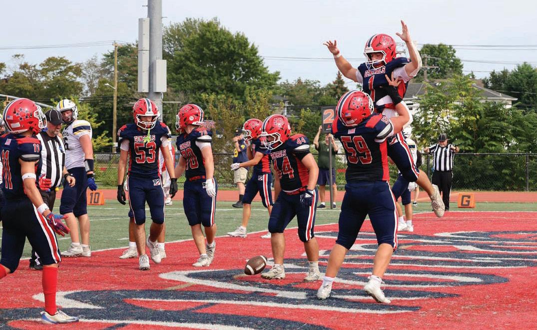 Members of the MacArthur High School varsity football team cheered after a touchdown during the homecoming game against Jericho High School on Sept. 27.