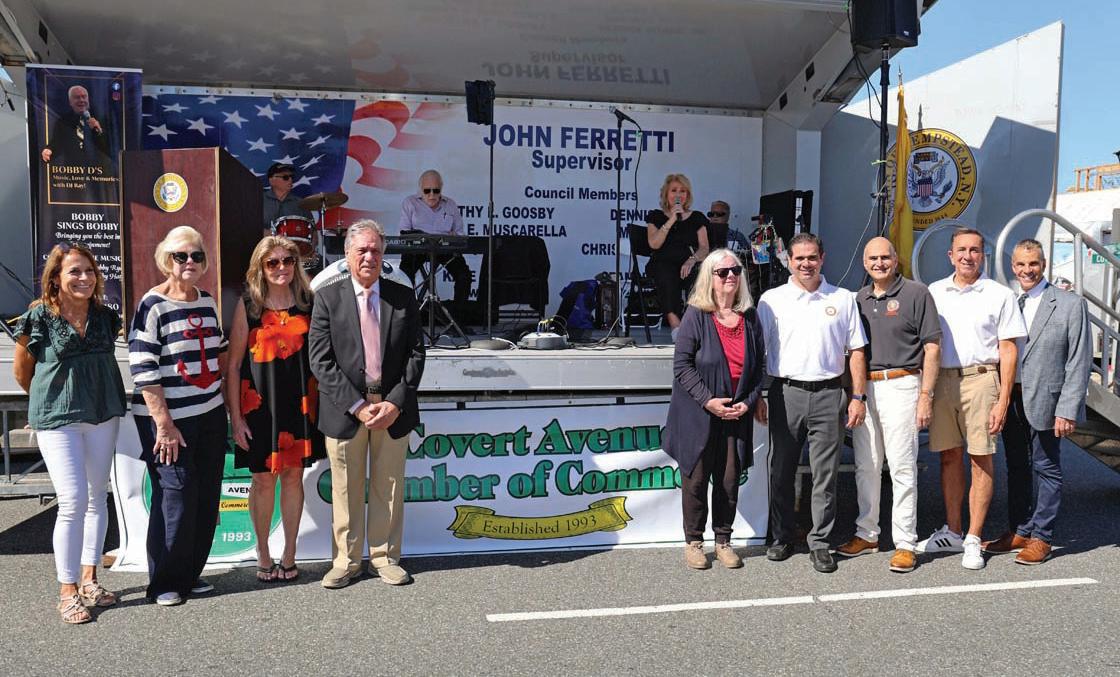 Hempstead Town Supervisor John Ferretti (fourth right), Councilman Tom Muscarella (right), and Receiver of Taxes Jeanine Driscoll (left) greeted members of the Covert Avenue Chamber of Commerce during the Street Fair on October 4.