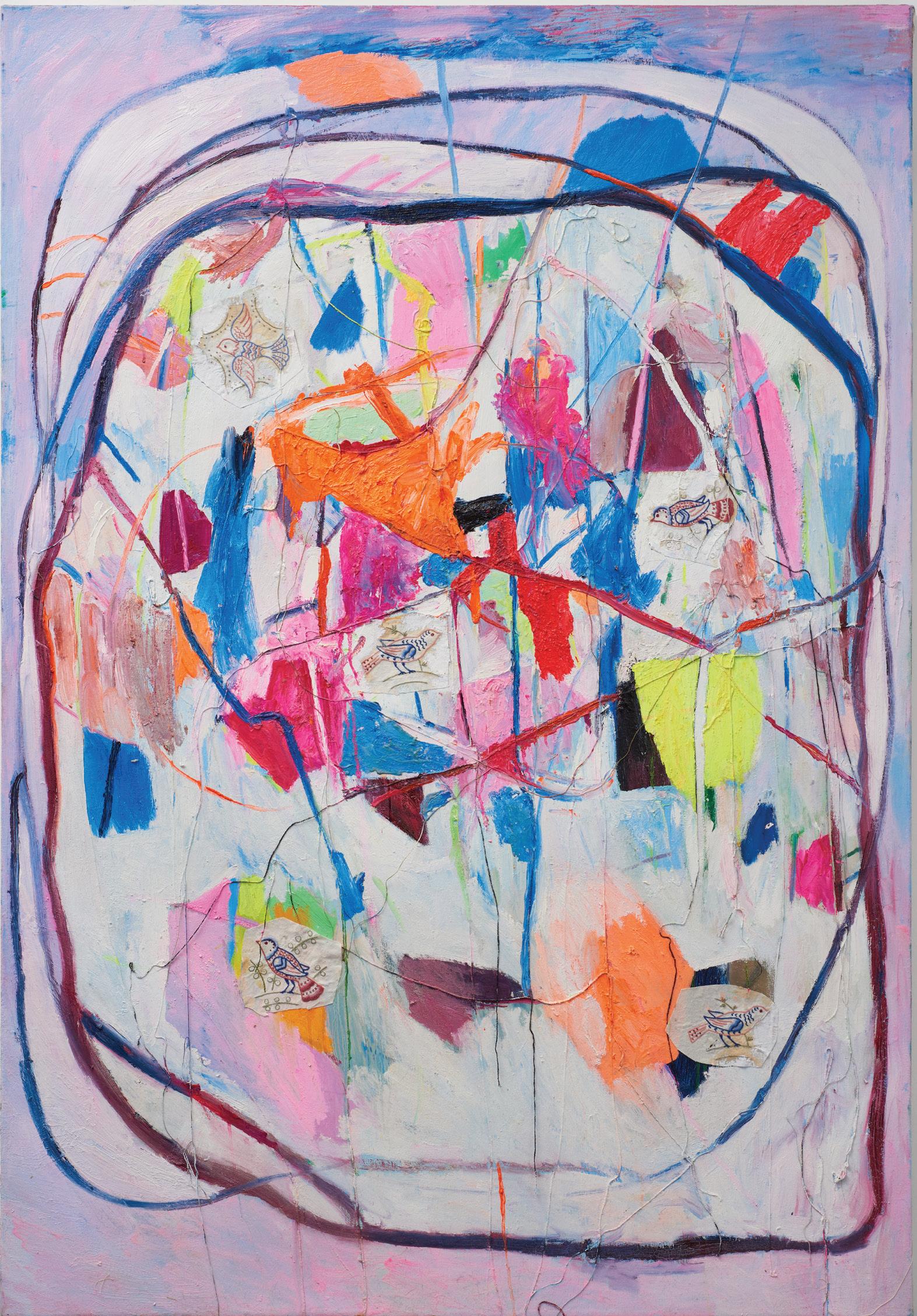 Mixed media, textile and oil on canvas