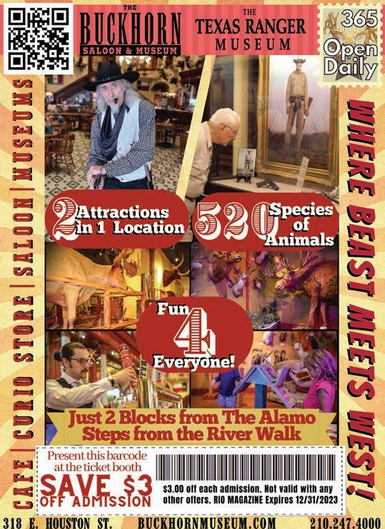 Rio Magazine is published by Traveling Blender, LLC. (Publisher) on behalf of Visit San Antonio. Reproduction in any manner in whole or in part is prohibited without the express written consent of Visit San Antonio. Material contained herein does not necessarily reflect the opinion of Visit San Antonio or its staff. Rio Magazine, the Publisher and Visit San Antonio reserve the right to edit all material for clarity and space and assumes no responsibility for accuracy, errors or omissions. Rio Magazine does not knowingly accept false or misleading advertisements or editorial nor does the Publisher or Visit San Antonio assume responsibility should such advertising or editorial appear. Articles and photos are welcome and may be submitted to our office to be used subject to the discretion and review of the Publisher and Visit San Antonio. All
