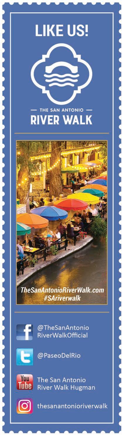4 RIO Magazine TheSanAntonioRiverWalk.com #SAriverwalk RIO Magazine is an official publication of Visit San Antonio. All expressions of opinions and statements of supposed facts are published on the authority of the writer and cannot be regarded as expressing the views of Visit San Antonio or its Publisher. Advertisements do not imply sponsorship or endorsement by the Visit San Antonio or its Publisher.