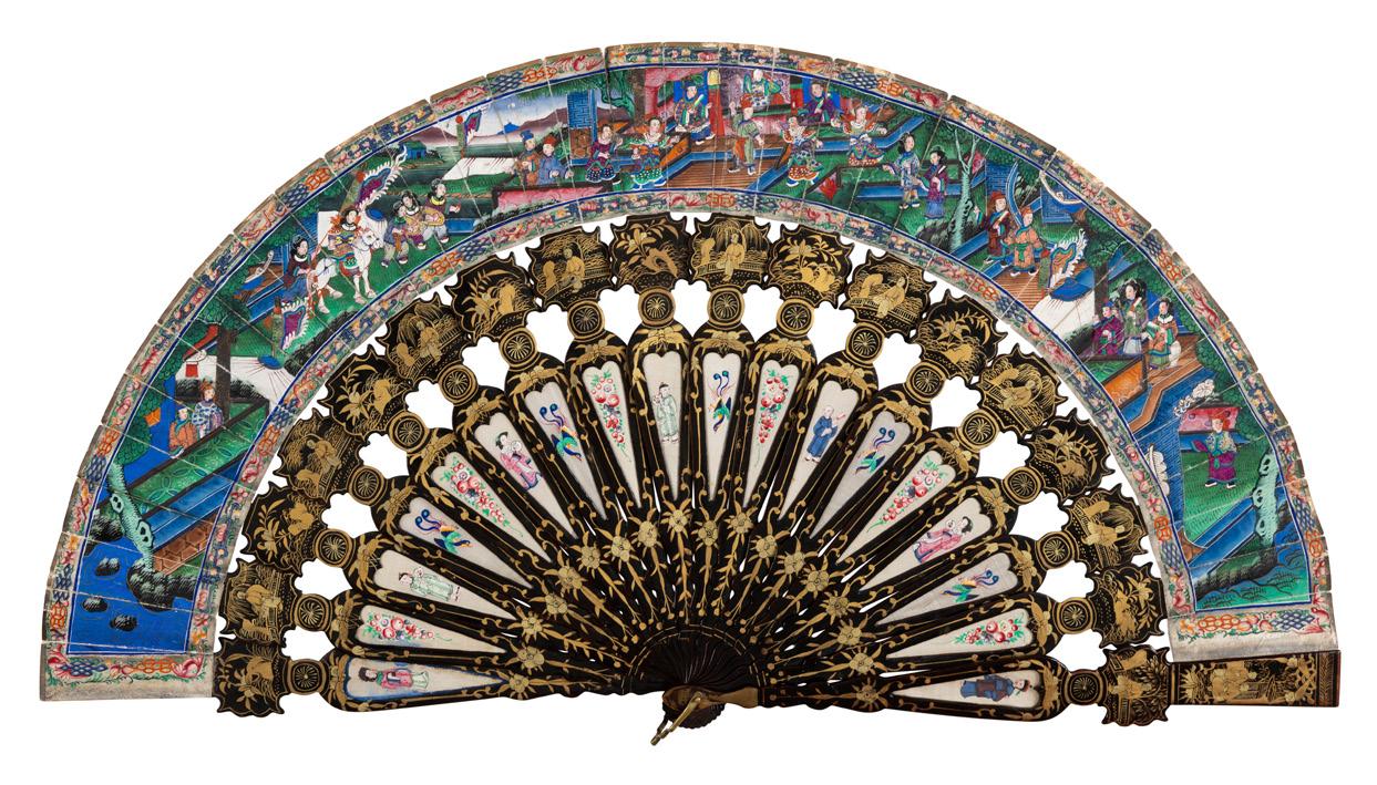fan leaves brightly painted on both sides with small figures amongst pavilions or landscape, each figure with finely detailed faces and applied silk clothing, the middle of the guards and sticks attached with a heart-shaped silk painting respectively adorned with figures or animals, further decorated with giltlacquer against a black ground with various garden scenes 27.5cm high